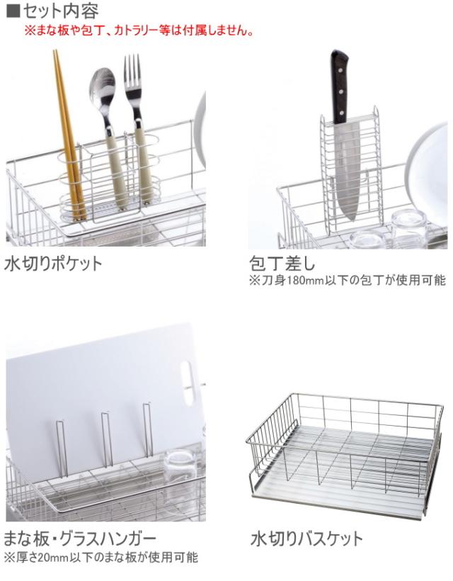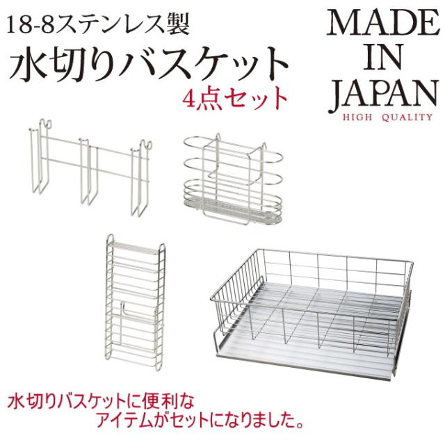日本製水切りバスケット 4点セット 日本製 キッチンラック 水切りトレー トレー 食器 シンク まな板 グラス 包丁 カトラリー