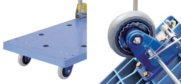 | 滑り止め 荷物の滑り落ちを防ぐために台車部分に滑り止めを付け、作業の安全性を高めました。 | キャスター 自在キャスター付の旋回部と軸受け部に、ラジアルボールベアリングを採用しています。キャスターのゴムには床面の汚れが移りにくいゴムを使用し、黒いわだちが付着しないよう工夫しています。 |