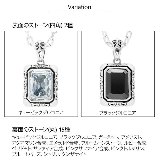 表面のストーン(四角)はキュービックジルコニアまたはブラックジルコニア、裏面のストーン(丸)は選択肢の各種ストーンからお選び頂けます。