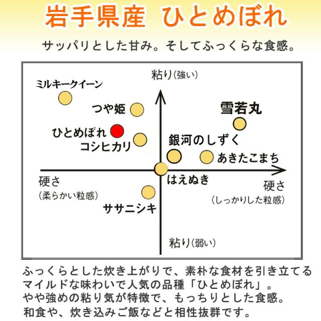 『ひとめぼれ』ひとめぼれの名前の由来は、お米を見て美しさに一目惚れしていただき皆様に愛されるお米になるようにとの願いを込めて『ひとめぼれ』と名付けられました。作付面積は、コシヒカリに次ぐ規模となっている人気の高い品種です。食味面では、コシヒカリと同等レベルに位置するお米です。粘り・ツヤ・うまみ・甘み・香りのトータルバランスがよく、特に保温後や温め直し後、冷めた時の粘りはコシヒカリ以上との評判もあります。程よい粘り気があり、柔らかな炊き上がりなので、焼き魚や刺身などの和食との相性は特に高い評価を得ています。