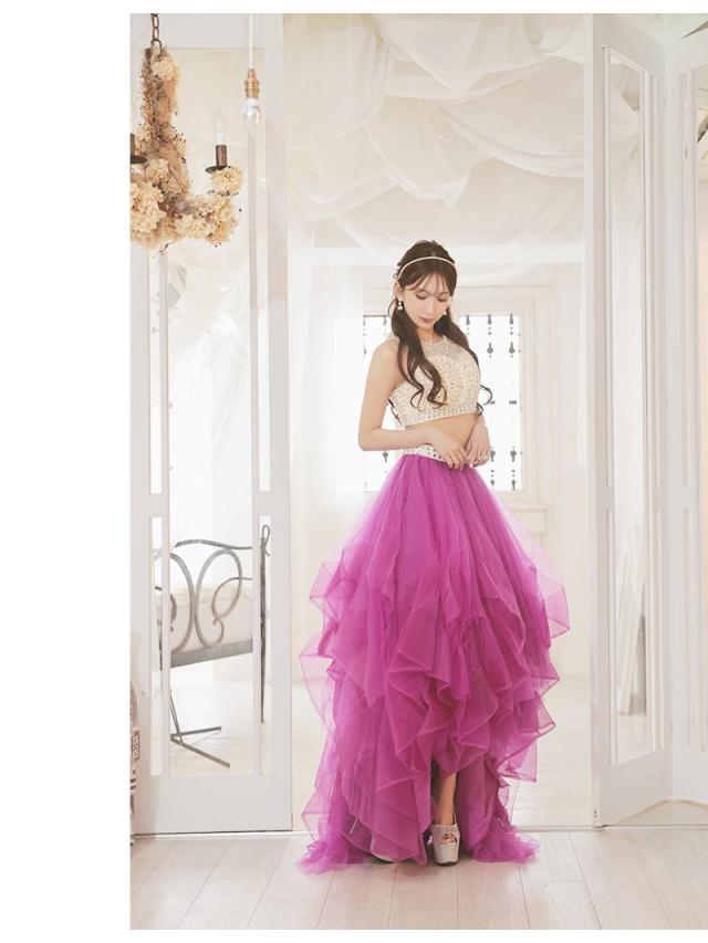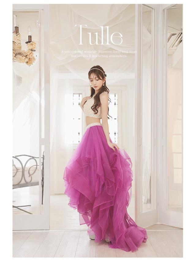 ☆贅沢ビジューが散りばめられたノースリーブトップスが豪華な2Pドレスはふわっとしたボリュームのオーガンジー素材スカートが華やかな前ミニロングドレス♪
