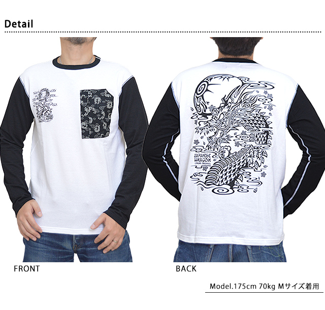 CHIGIRIさんから「トライバル龍胸ポケット付き袖切替ロングTシャツ(CHL47-751)」のご紹介です。 トライバルで表現した龍を背中にプリントした長袖Tシャツです。 フロント右胸には龍を配置。 ボディーには、綿100%のさらりとした肌触りの薄手なTシャツ生地を使用。 | |||||||||||||||||||||||||