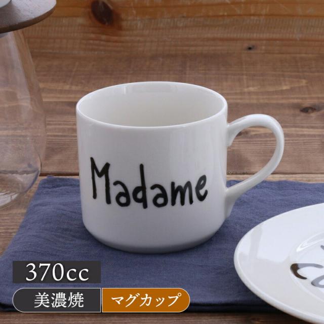 手書き風文字のフランス語「Madame」(夫人)があしらわれた、おしゃれなマグカップ。
