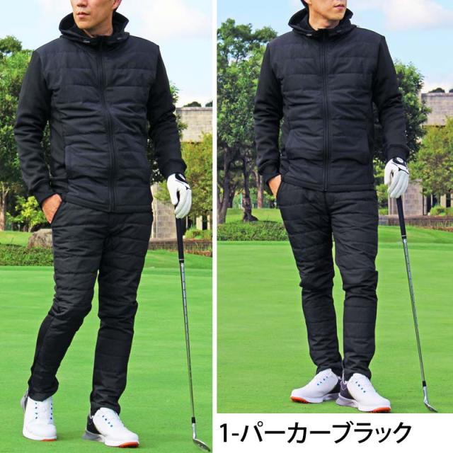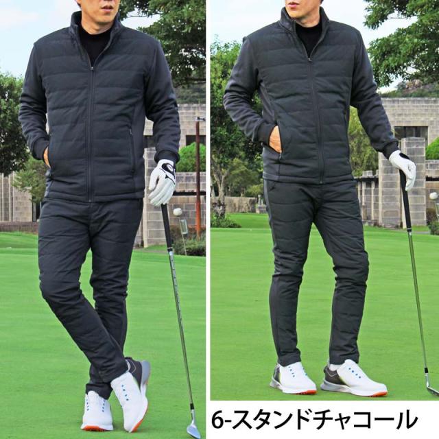 ダウンジャケットとダウンパンツのゴルフウェア上下セットアップ。