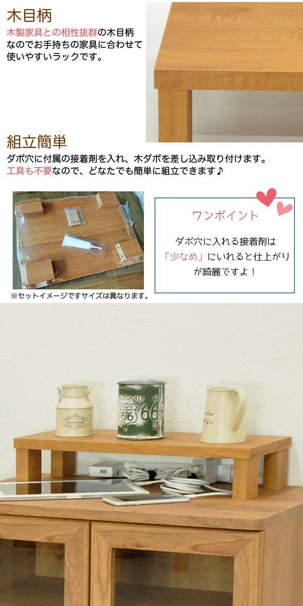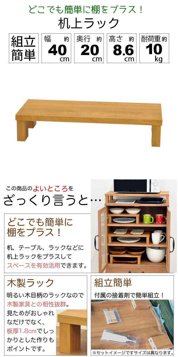 ・明るいナチュラル色の机上ラックは、上置き棚としてちょっとした場所に棚を増やしたい時に便利な追加棚です。