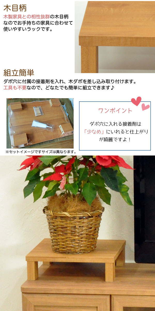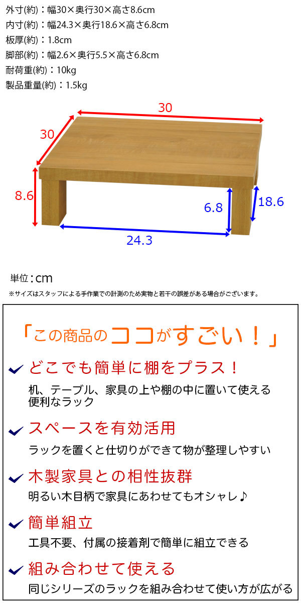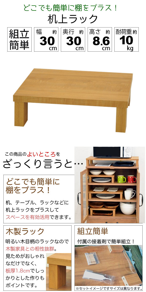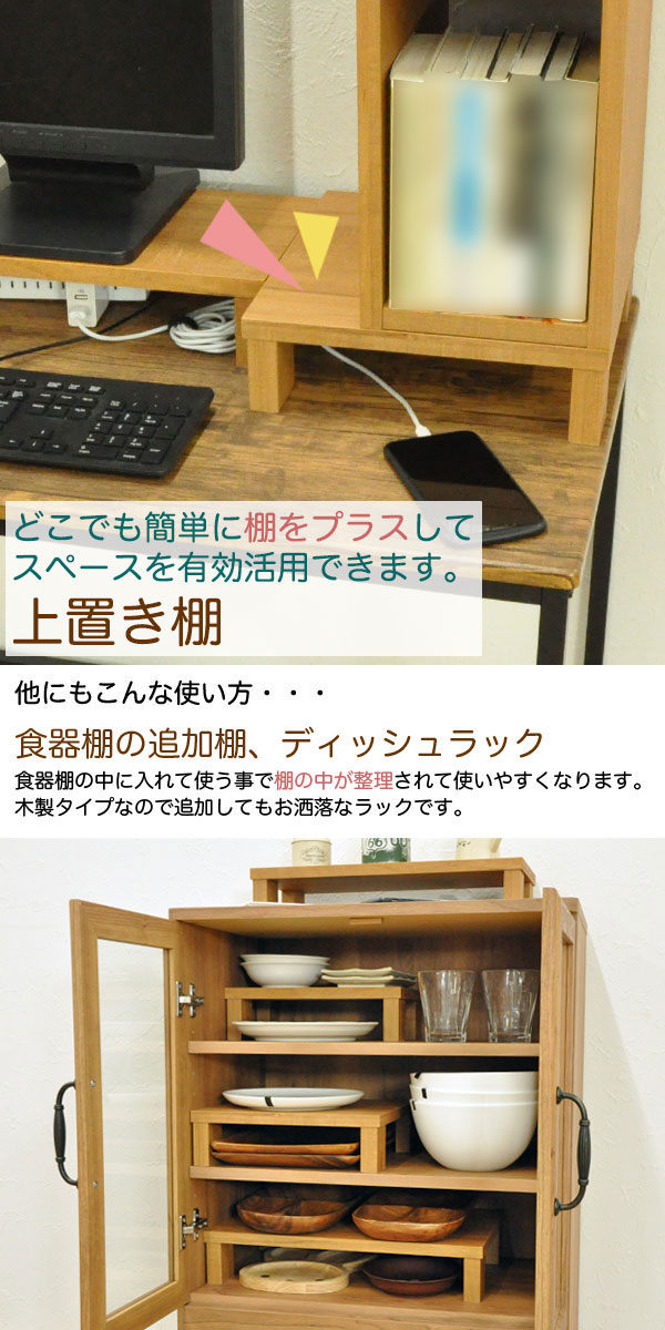 ・明るいナチュラル色の机上ラックは、上置き棚としてちょっとした場所に棚を増やしたい時に便利な追加棚です。