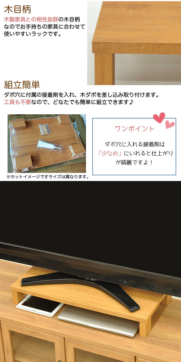 ・明るいナチュラル色の机上ラックは、上置き棚としてちょっとした場所に棚を増やしたい時に便利な追加棚です。