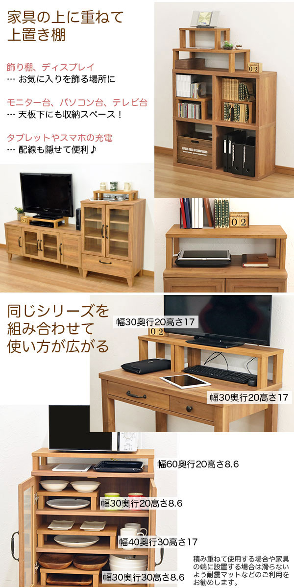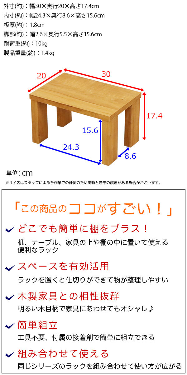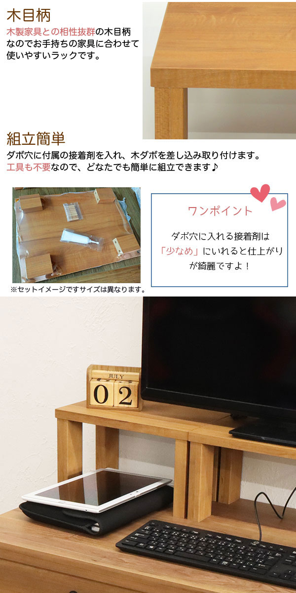 ・明るいナチュラル色の机上ラックは、上置き棚としてちょっとした場所に棚を増やしたい時に便利な追加棚です。