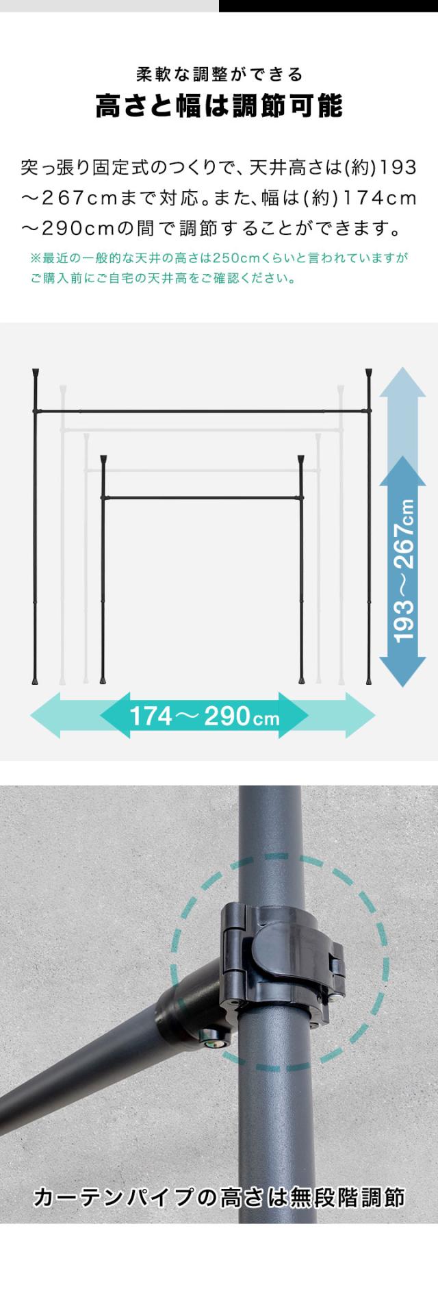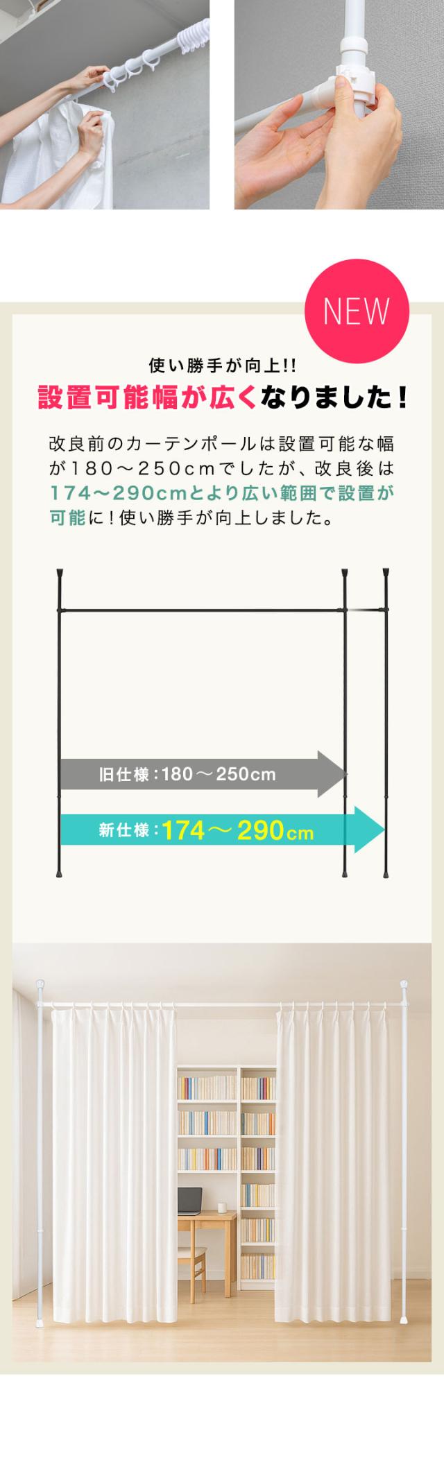 つっぱり カーテンポール 幅174?290cm カーテンレール 伸縮 間仕切り 目隠し 賃貸OK 穴あけ不要 工具不要 高さ調節 天井 突っ張り 突っ張り棒 カーテン シングル 遮光カーテン対応 シンプル ※リング付き/カーテンフック別売 1年保証 送料無料