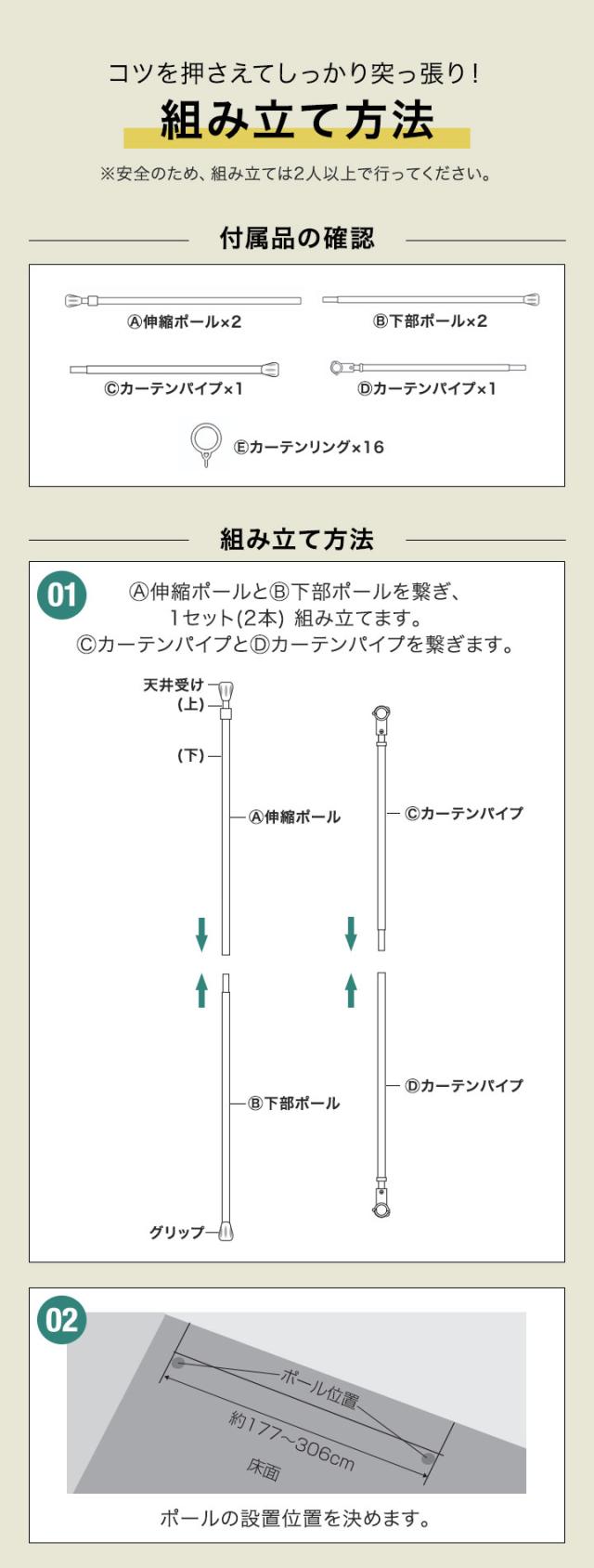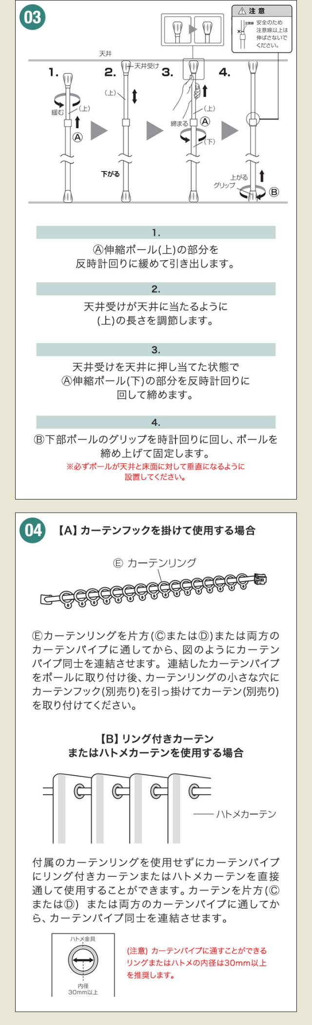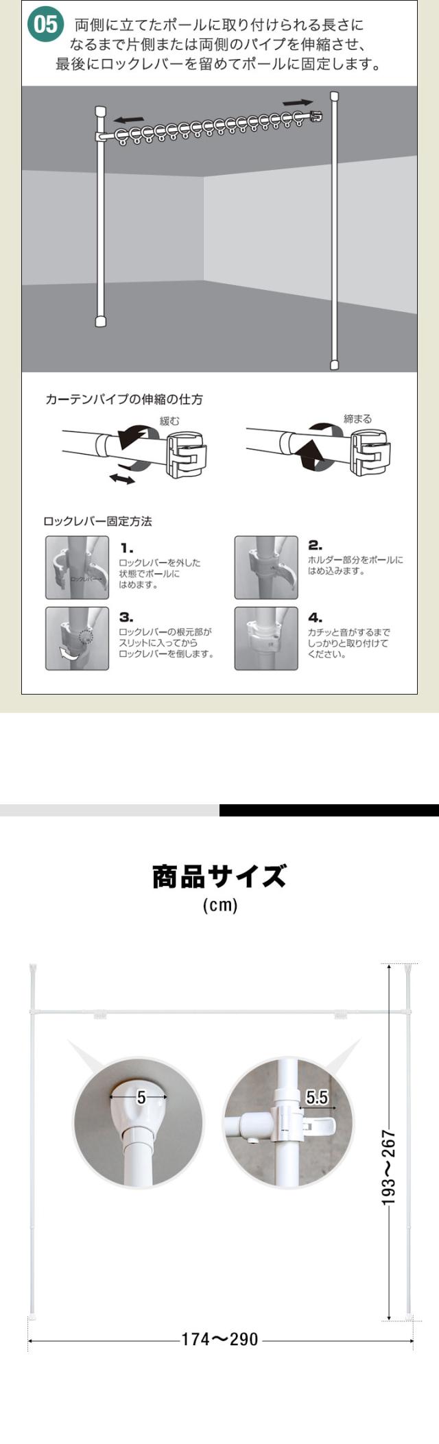 - 間仕切りのために、購入しました。私は一人暮らしなので、何とか一人で設置しました。説明書の通りに組み立ててみたけど、伸縮ポールの方にカーテンパイプのロックレバーは固定できませんでした。なので、縦のパイプを逆にして使ってます。私の理解が間違っている可能性もあるので、苦情ではありません。でも、今のところちゃんとカーテンをかけて、間仕切りに役立っています。