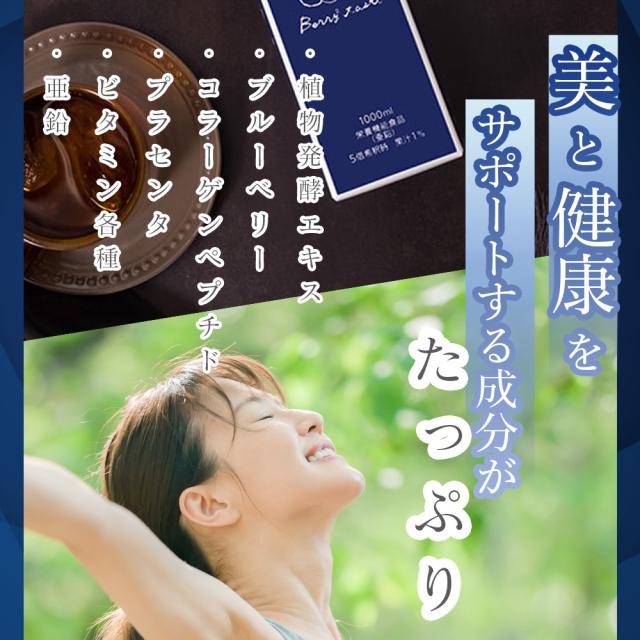 | 原材料名 | イソマルトオリゴ糖(国内製造)、りんご酢、高果糖液糖、植物発酵エキス、ブルーベリー果汁、りんご果汁、マキベリーエキス、ベリー混合エキス(野生種ブルーベリー、ストロベリー、クランベリー、野生種ビルベリー、エルダーベリー、ラズベリー)、水溶性珪素濃縮溶液、フィッシュコラーゲンペプチド、豚プラセンタエキス末/酸味料、香料、来るこん酸亜鉛、甘味料(ステビア、スクラロース)、アントシアニン色素、ビタミンA、ビタミンE、ヒアルロン酸、ビタミンC、ビタミンB1、ビタミンB2、ビタミンB6、ヘマトコッカス藻色素、(一部にキウイフルーツ・大豆・豚肉・もも・りんご・ゼラチンを含む) |