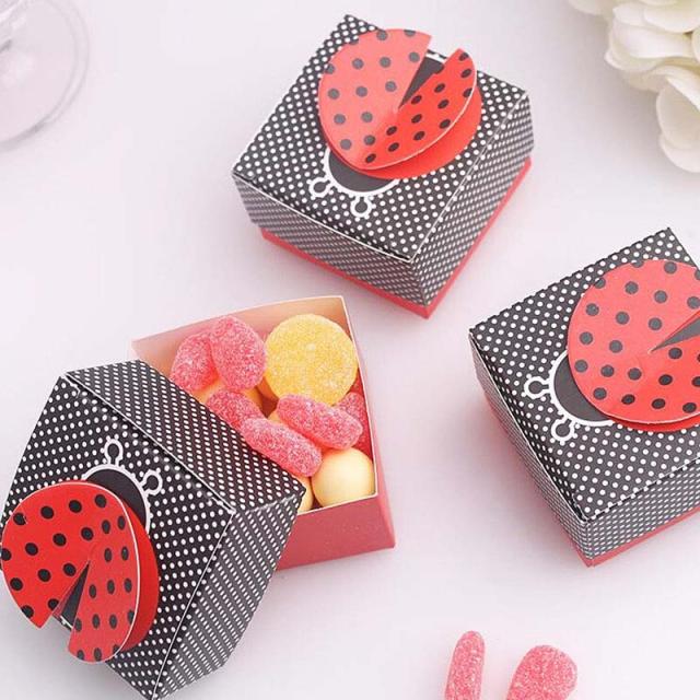 お子様からも人気の天道虫をモチーフにした可愛い結婚式やウエディング、披露宴パーティーでウエルカム用の飴やクッキー、誕生日パーティーなどのお菓子を入れるラッピング用の組み立て箱。
