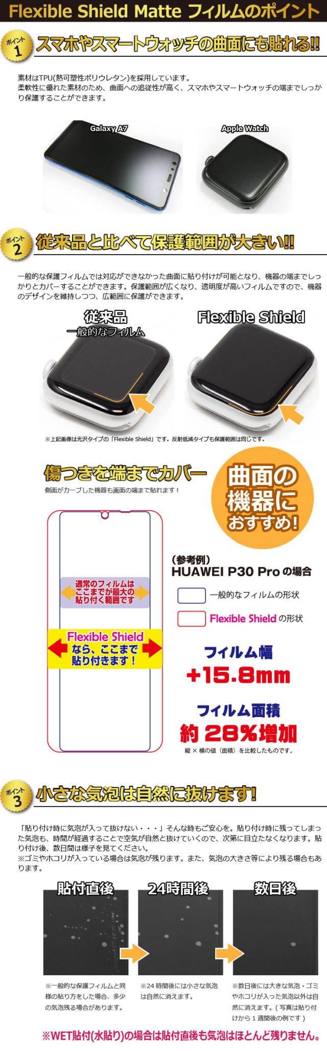 柔軟性に優れた素材のため、曲面への追従性が高く、スマホやスマートウォッチの端までしっかり保護することができます。