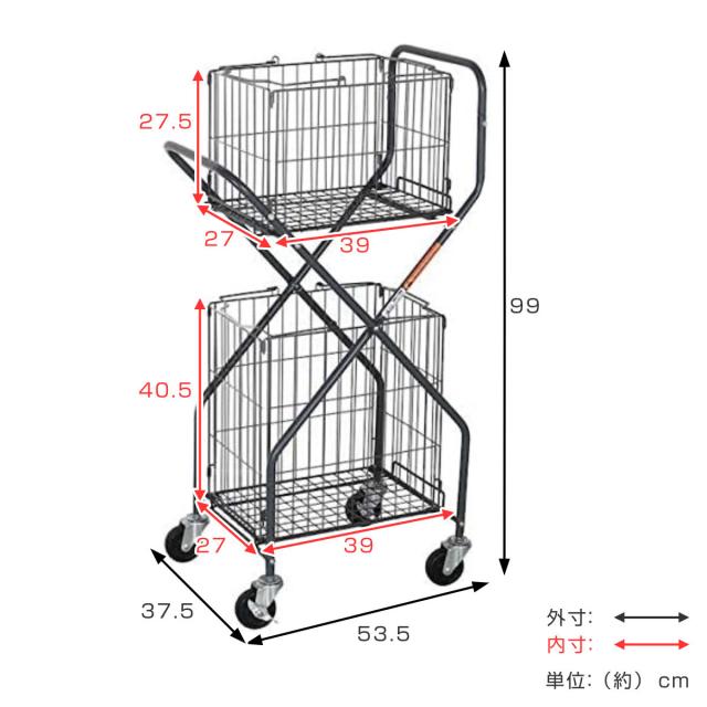 | サイズ | 約 幅53.5×奥行37.5×高さ99(cm) 上段カゴ内寸:約幅39×奥行27×高さ27.5(cm) 下段カゴ内寸:約幅39×奥行27×高さ40.5(cm) |
