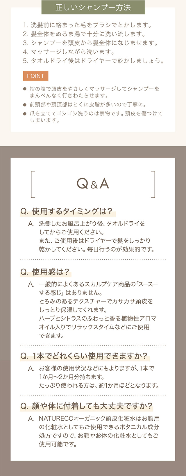 | 使用方法 | 適量を頭皮に塗布し、マッサージしながらなじませてください。 |