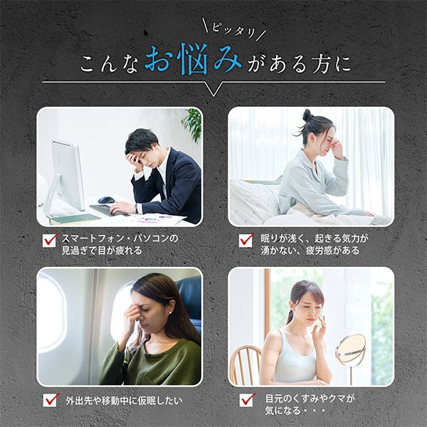 - 眼精疲労がひどいので購入しました。 寝ながら使用していても、時間で切れるので安心です。 充電も短時間なので、毎日朝起きた時や夜使用前に充電して使用してます。