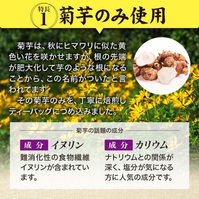 菊芋は、キク科ヒマワリ属の多年草の植物で、注目の水溶性食物繊維「イヌリン」を含んでいる事で知られています。本品は、菊芋100%を使用しており、じっくり焙煎し、風味豊かに仕上げました。ノンカフェインですので、ご家族皆様で毎日美味しくご愛用いただけます。皆様の健康生活や健康習慣にお役立てください。