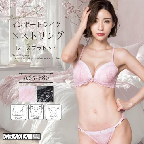 【グラシア】 ブラジャー ショーツ セット ブラセット ランジェリー 下着 カップ ストリング センシャル パッド ふんわり インポートライク 伸縮性 レース アイラッシュレース ピンク ブラック