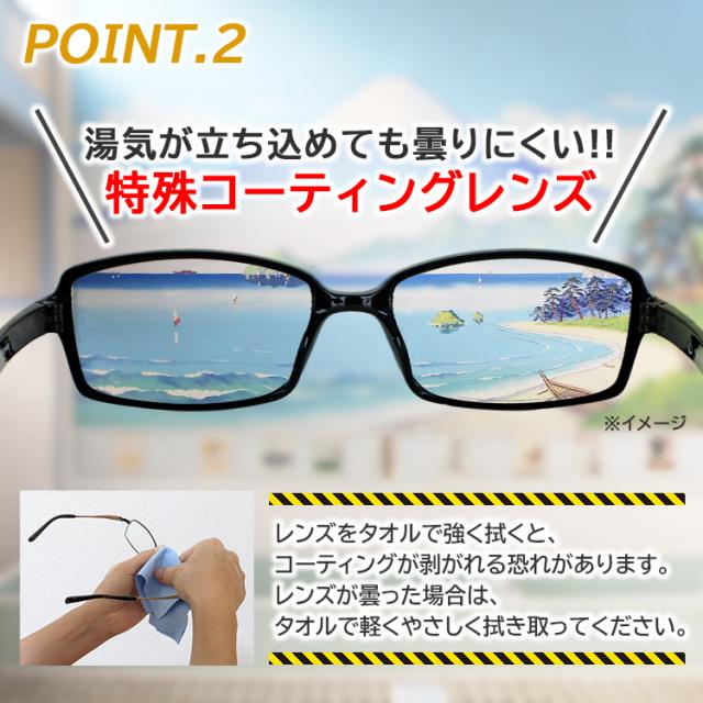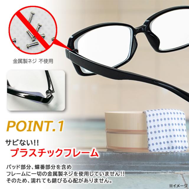 | 商品詳細 【 お風呂メガネ 】 近視でめがねを外すと温泉やお風呂で見えにくくて不便。 そんな方におすすめ!人気のお風呂メガネです。 普段使いの眼鏡をお風呂に持ち込むのが不安な方や、 普段コンタクトを使用されている方にもおすすめです♪ 自宅のお風呂や浴場・温泉が安全・安心に楽しめます。 男女兼用モデルですので、ユニセックスでご使用いただけます。 POINT1 サビない!!プラスチックフレーム。 重量は約19gと軽量です。 テンプルは柔軟性のある素材を使用し、顔への締め付けを軽減し、優しい掛け心地。 パッド部分、蝶番部分を含めて、フレームに一切の金属製ネジを使用していません。 そのため、お風呂など水場で濡れても錆びる心配がありません。 POINT2 湯気が立ち込めても曇りにくい!!特殊コーティングレンズ。 ※レンズをタオルなどで強く拭くと、コーティングが剥がれる恐れがあります。 レンズが曇った場合は、タオルで軽くやさしく拭きとってください。 POINT3 近眼度数入りで強度数の近視にも対応しています。 -3.00、-4.00、-5.00、-6.00、-7.00、-8.00の6度数をご用意。 (中国製) | |
