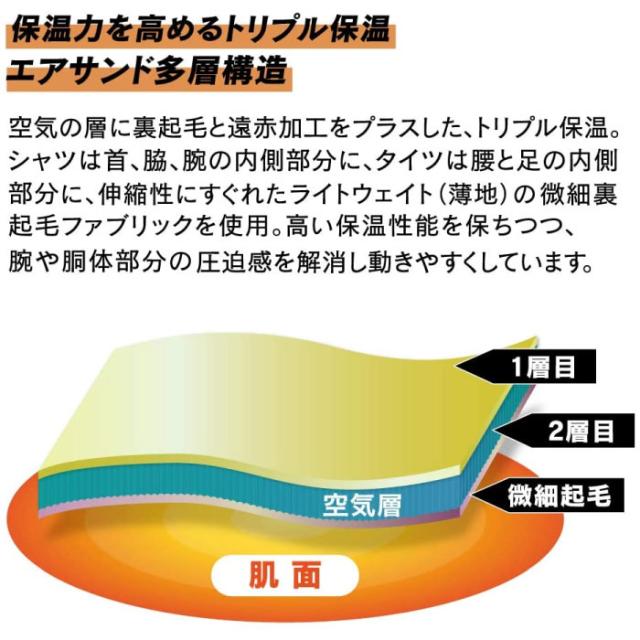保温力を高めるトリプル保温エアサンド多層構造空気の層に裏起毛と遠赤加工をプラスしたトリプル保温。