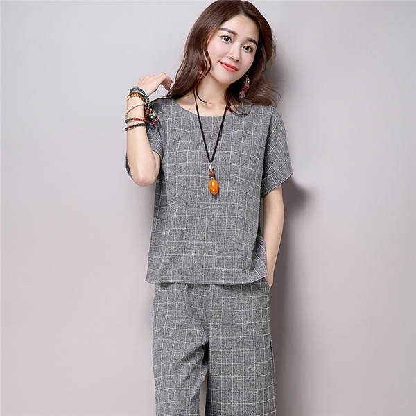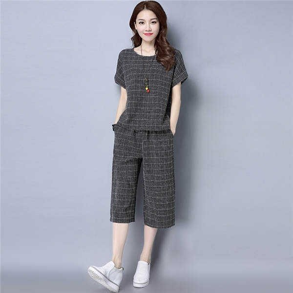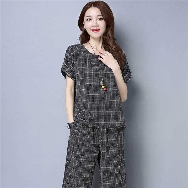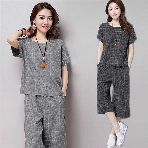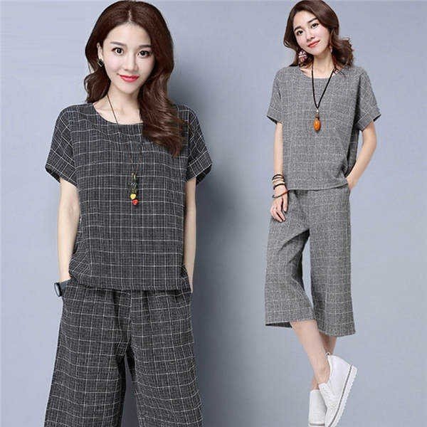 スウェット上下 レディース 綿麻 セットアップ上下 Tシャツ 半袖 チェック柄 リネンズボン 綿麻ズボン ガウチョ ワイドパンツ 体型カバー 春夏 ゆったり