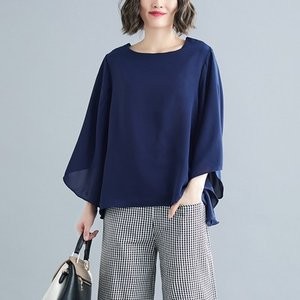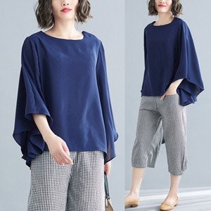 シフォンブラウス レディース 七分袖 シャツ 丸首 ブラウス 無地 フレアスリーブ 夏ブラウス ゆったり 大きいサイズ 体型カバー おしゃれ 夏物 新作 送料無料