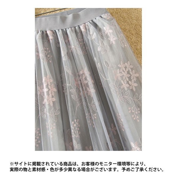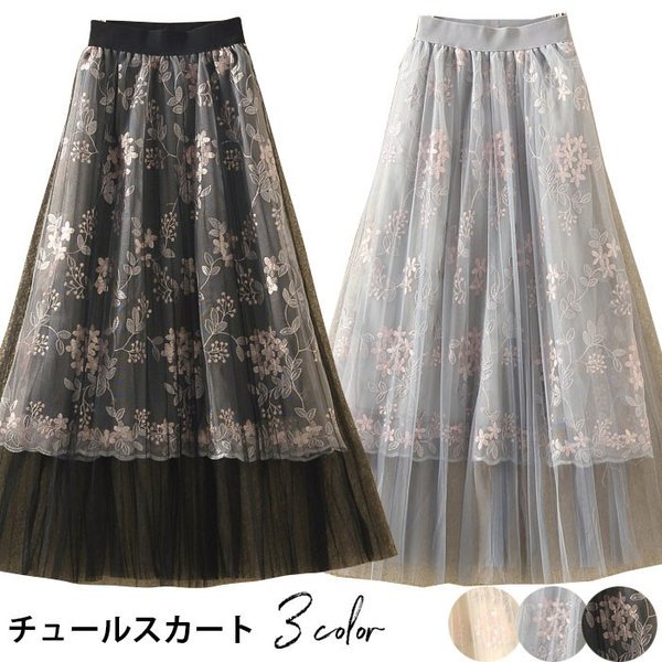 チュールスカート レディース 刺繍 ミモレスカート ロングスカート チュールスカート 花柄刺繍 薄手 プリーツスカート 裏地付き