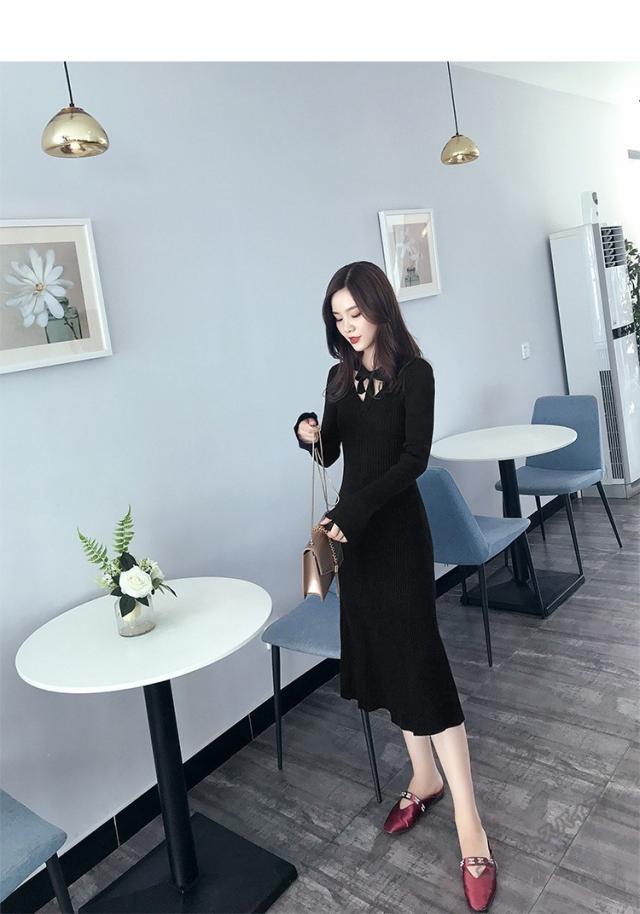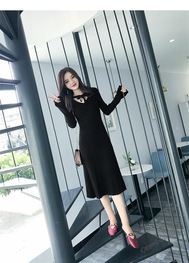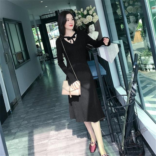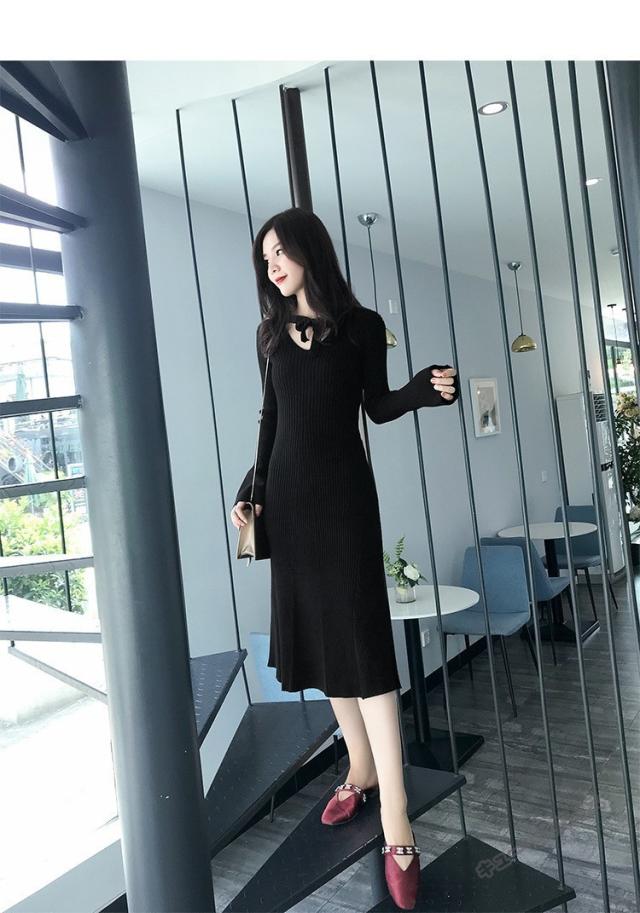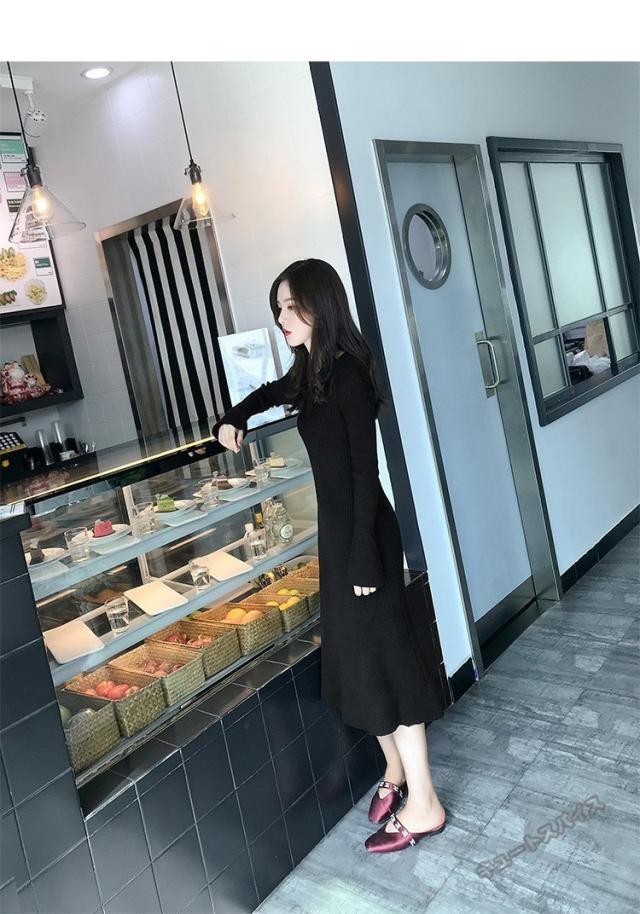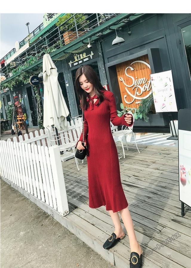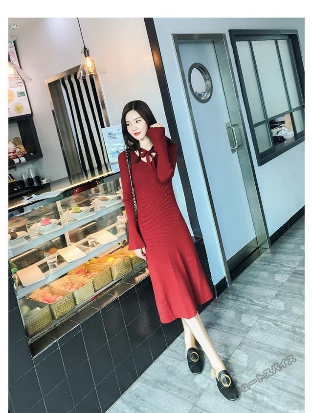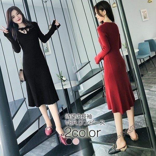 ニットワンピース マキシ ワンピース マキシ丈 ロング丈 ミディアム丈 長袖 秋ハイネック タイト スリット ワンピース 無地 レディース春秋