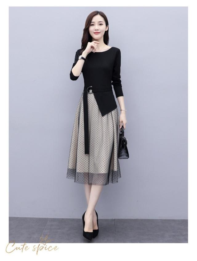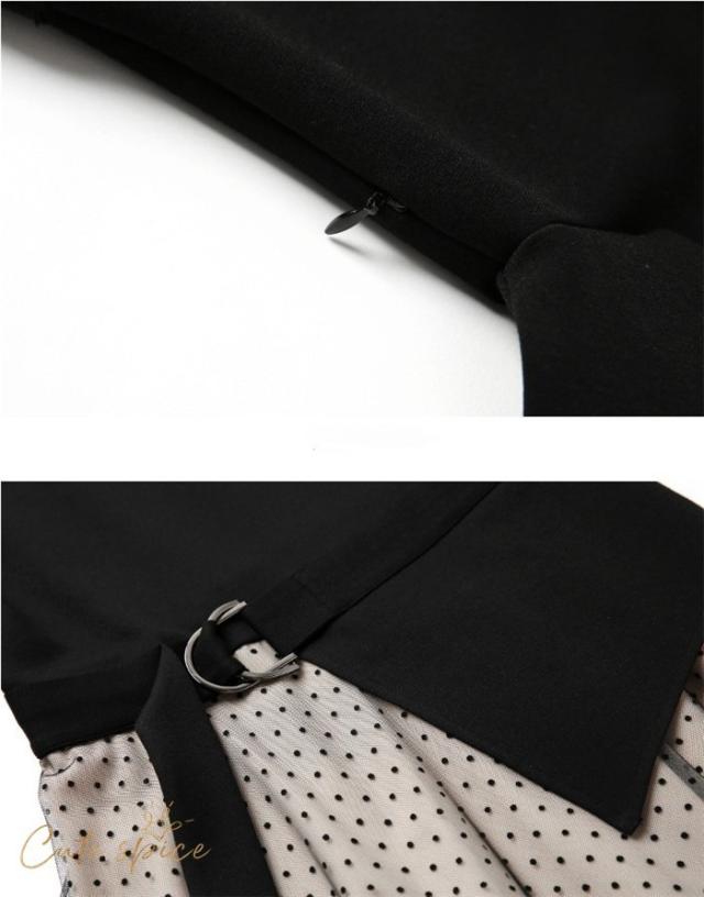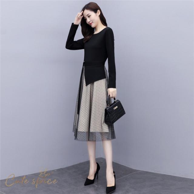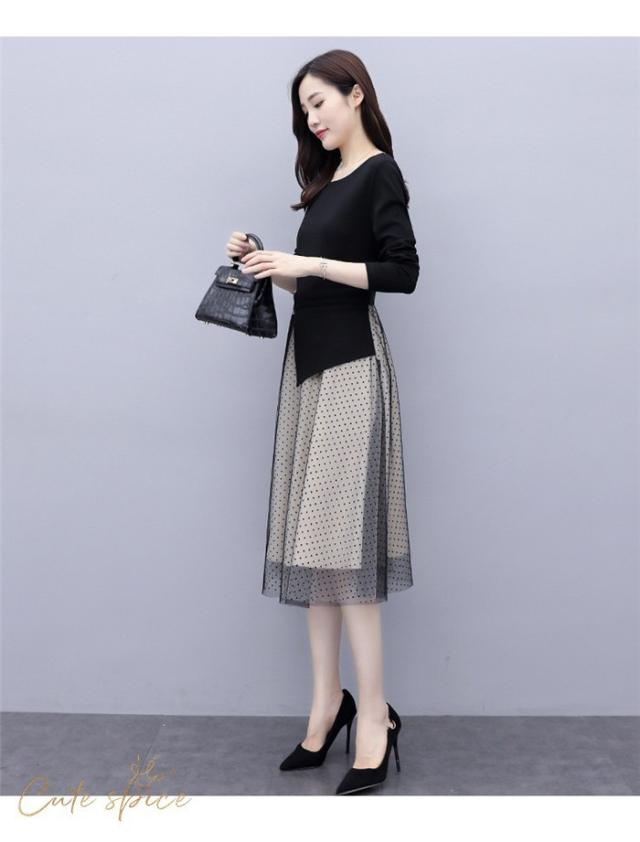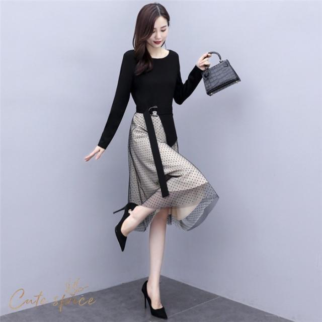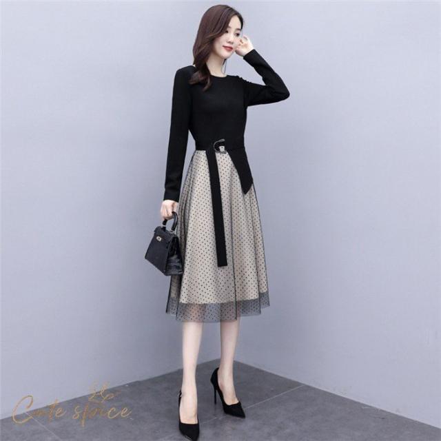 ワンピース レディース 春秋 40代 膝丈ワンピース きれいめ 長袖ワンピース ロング丈 Aライン チュールスカート 黒 大きいサイズ 着痩せ オシャレ 通勤