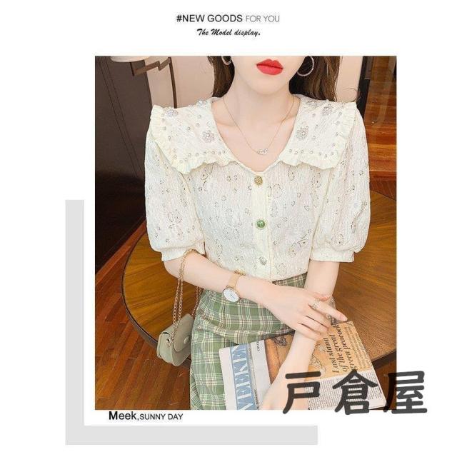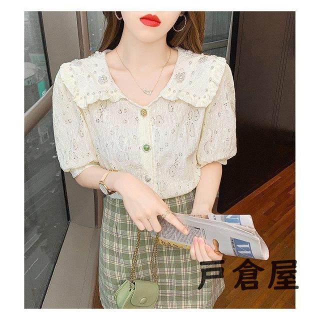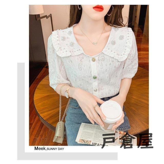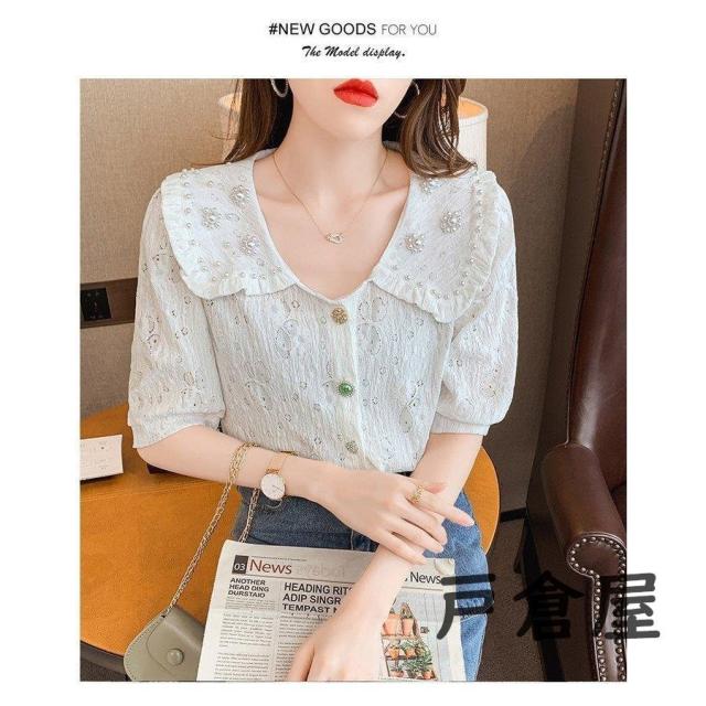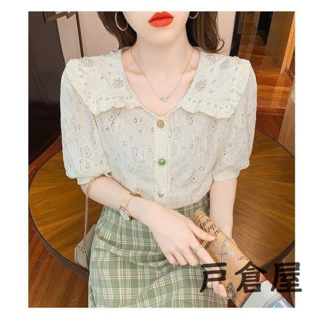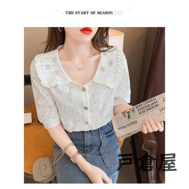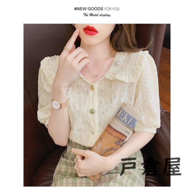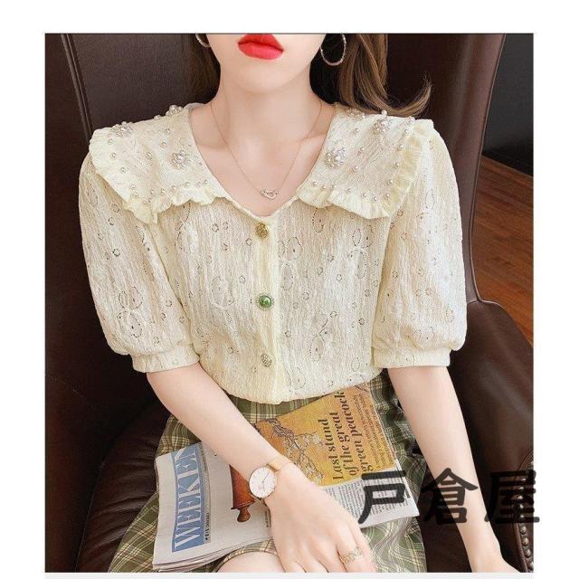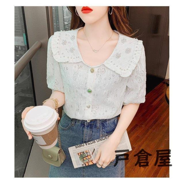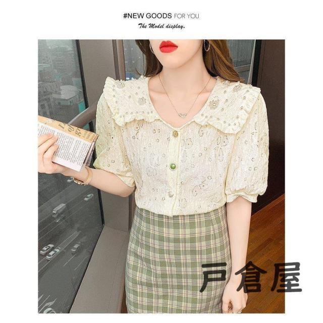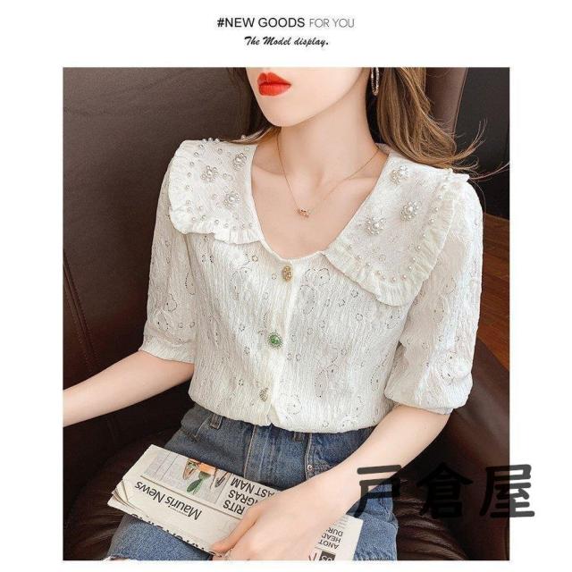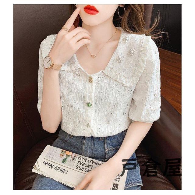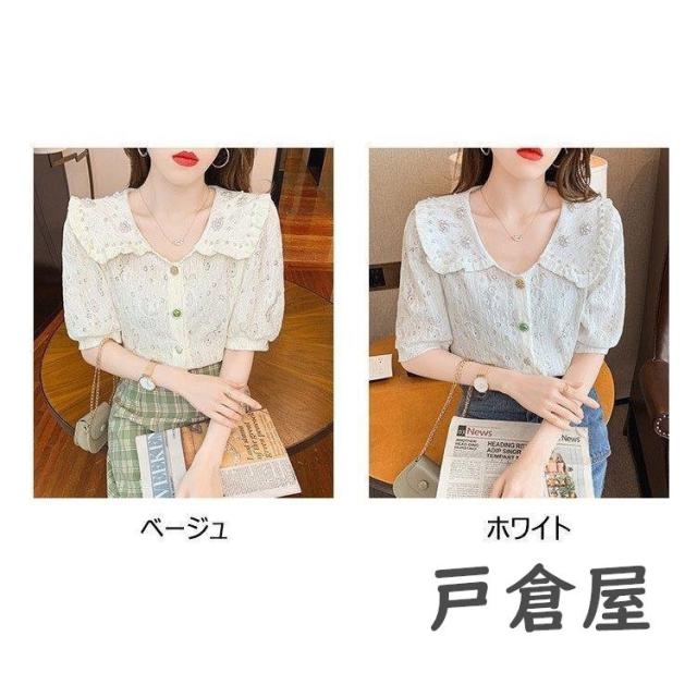 ブラウス レディース 40代 春夏新作 オシャレブラウス 白シフォンシャツ 半袖トップス レース折り襟 パフスリーブブブラウス上品 大人 通勤OL ゆったりシャツ