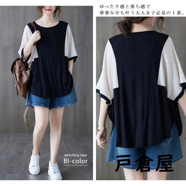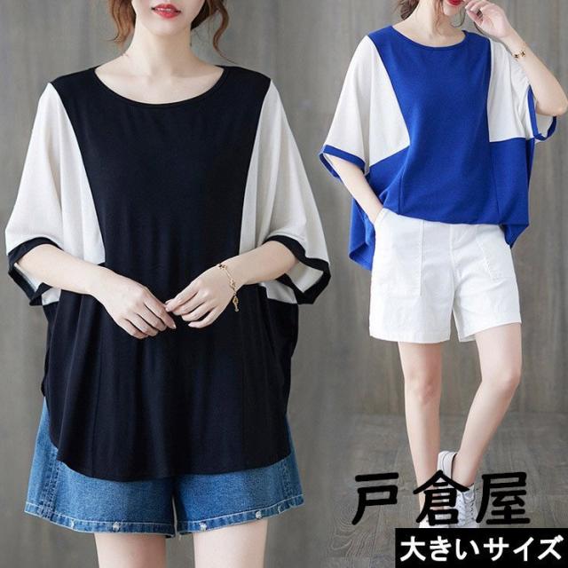 大きいサイズ レディース 配色トップス ドルマン袖 プルオーバー モモンガスリーブ LL 3L 4L 5L 6L ブラック ブルー 新入荷 2021