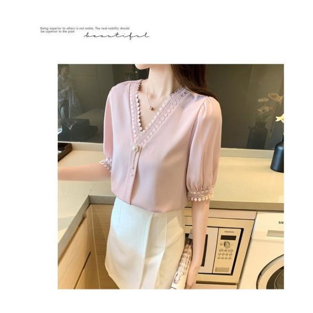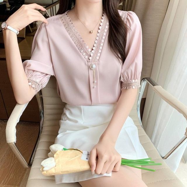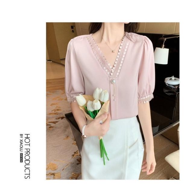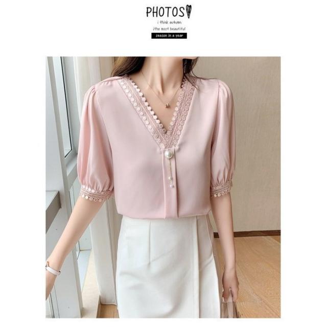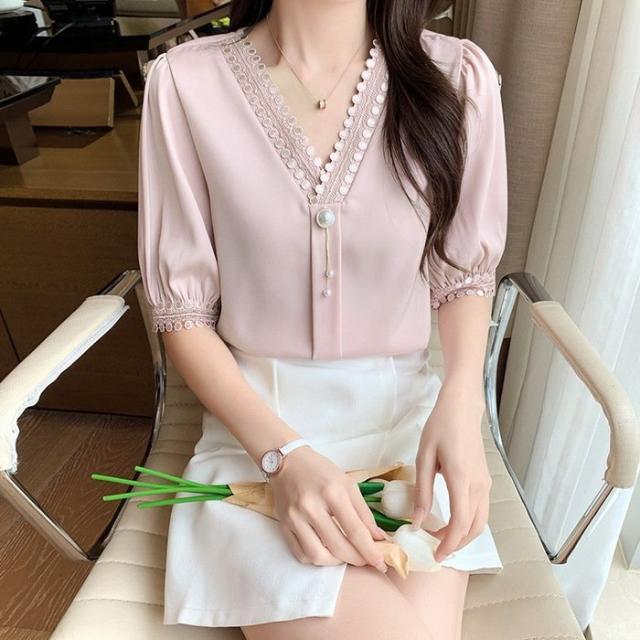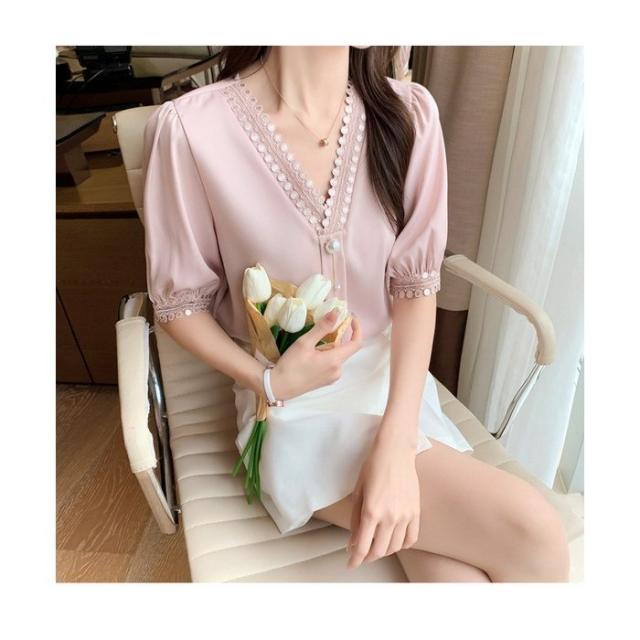 ブラウス レディース 40代 春夏新作 オシャレブラウス シフォンブラウスVネック パフスリーブブラウス 半袖トップス 韓国風 通勤OL ゆったりシャツ 30代50代