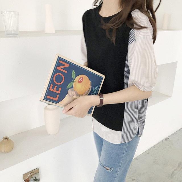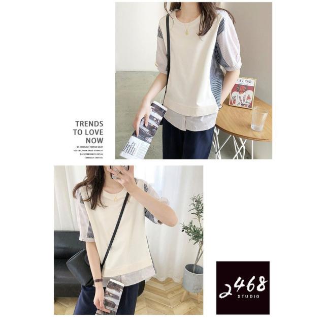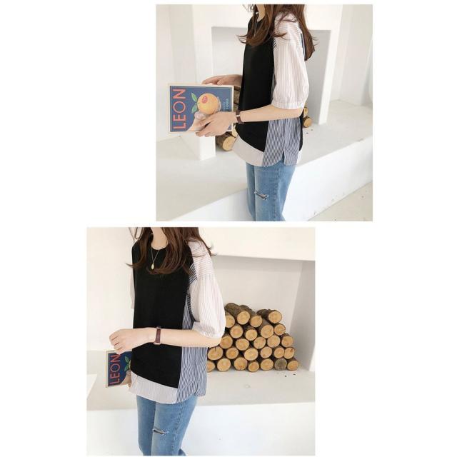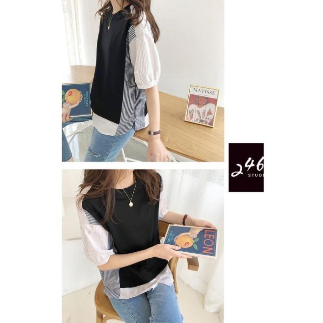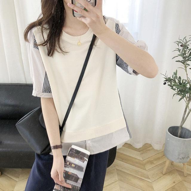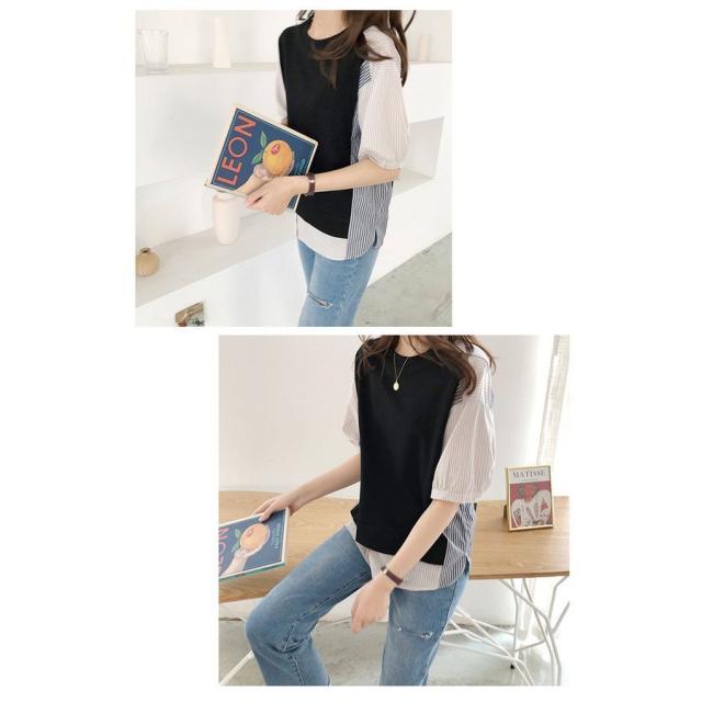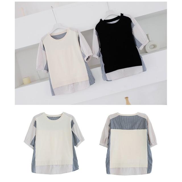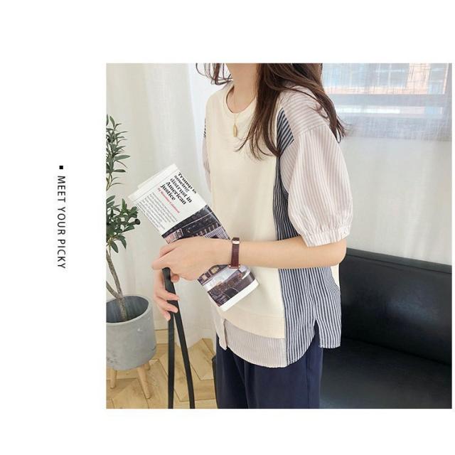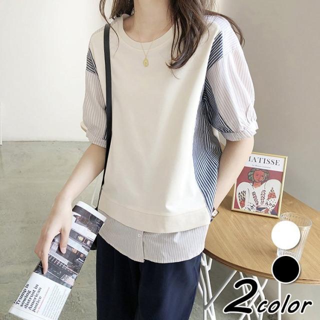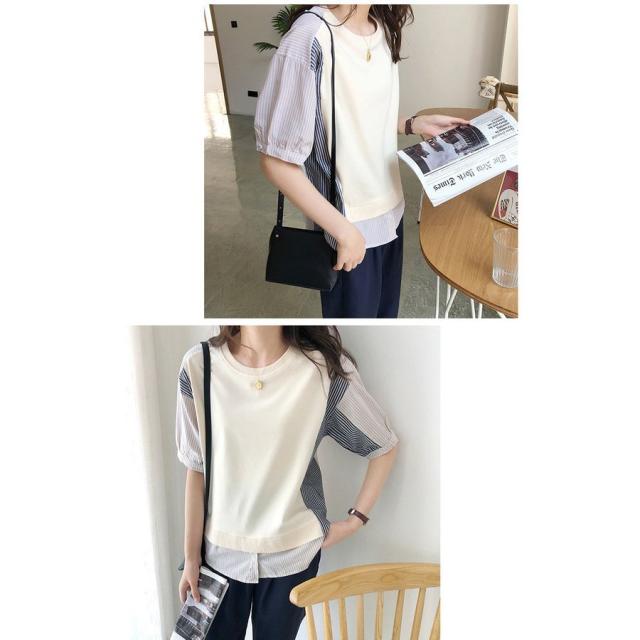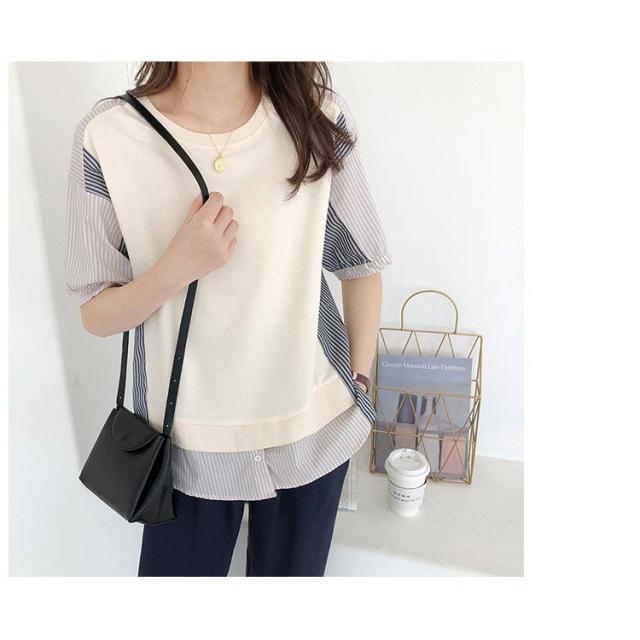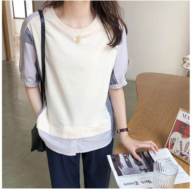ブラウス レディース 40代 春夏新作 オシャレブラウス ボーダー柄切り替えTシャツ 半袖トップス フェイクレイヤードブラウス 大人 通勤 ゆったりTシャツ 韓国風