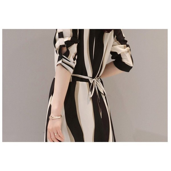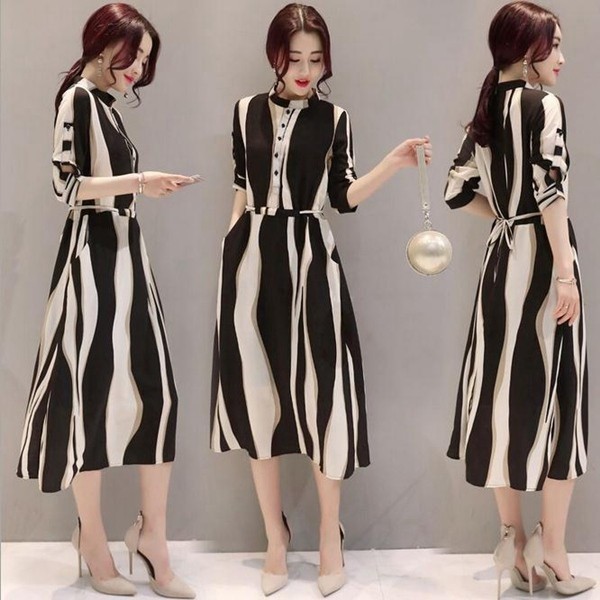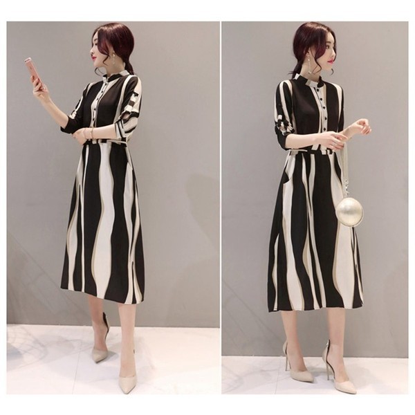ワンピース レディース 春夏 膝丈ワンピース シフォンドレス ボーダー柄 結婚式 ロング丈 五分袖 マキシワンピ ワンピース オシャレ 上品 着痩せ