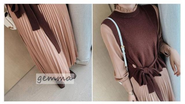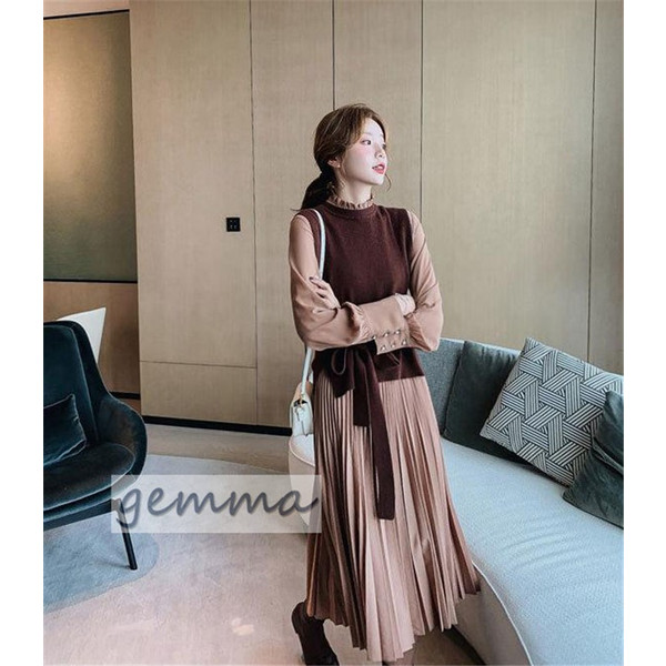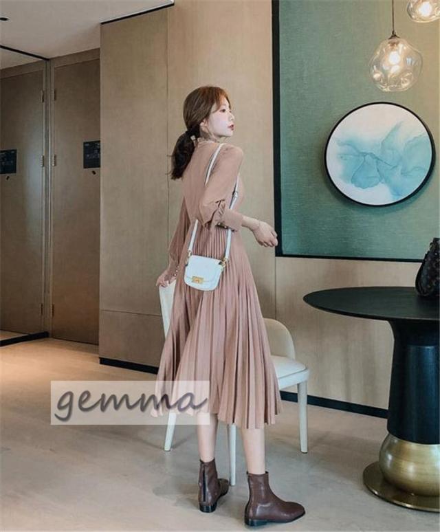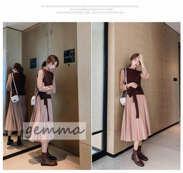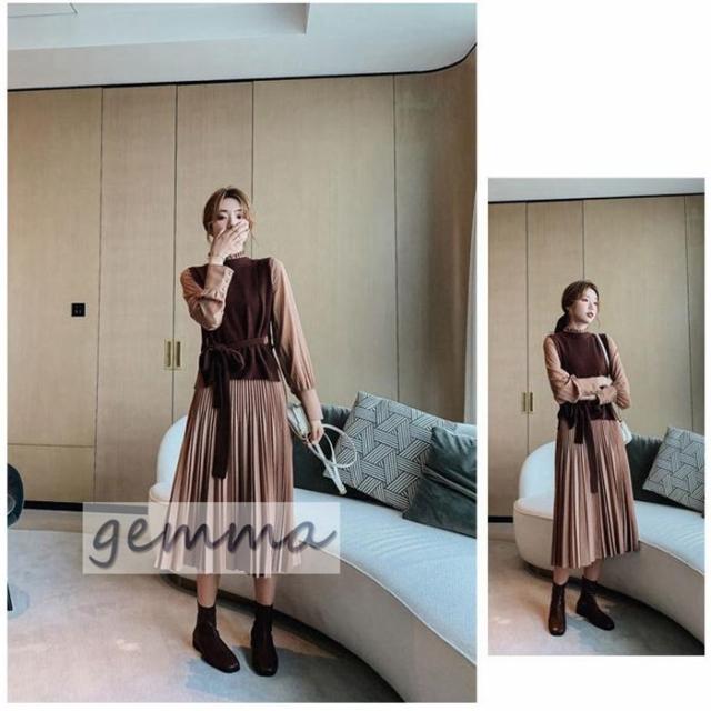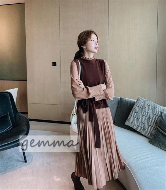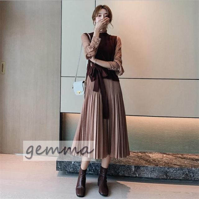 マキシワンピース 長袖 セットアップ ワンピース ベストセット ロング プリーツスカート レディース 秋 体型カバー 2点セット