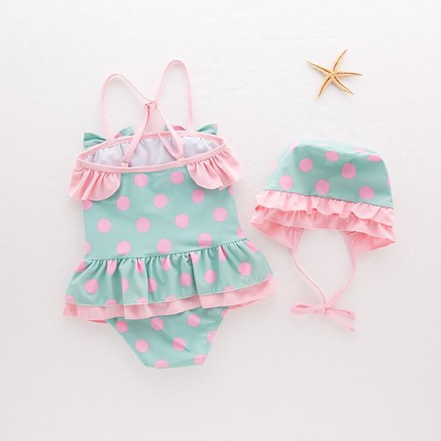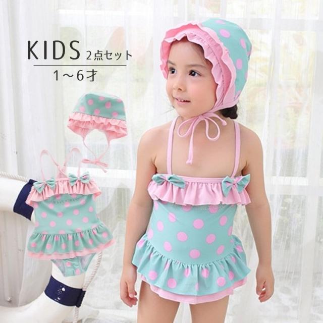 水着 キャップ 2点セット ワンピース スイムウェア キッズ 子供用 女の子 水泳用品 水玉 リボン フリル かわいい おしゃれ プール 海 リゾート