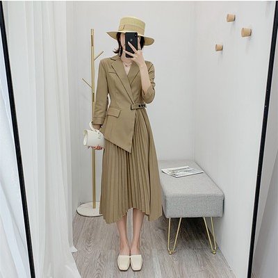 ワンピース レディース フェイクレイヤード 無地 長袖 ノッチドラペル プリーツ ひだ テーラードジャケット スーツ ベルト付き