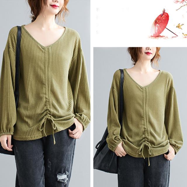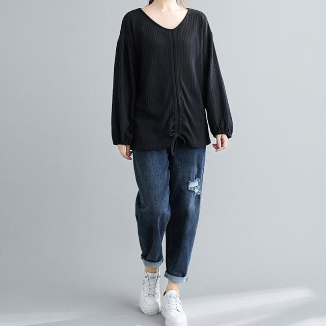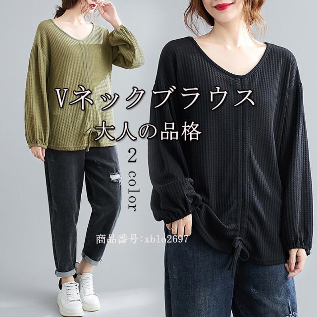 トップス ブラウス 長袖 レディース ニット パーカー リボン バルーンスリーブ Vネック チュニック シンプル 無地 通勤 秋 春 30代 40代