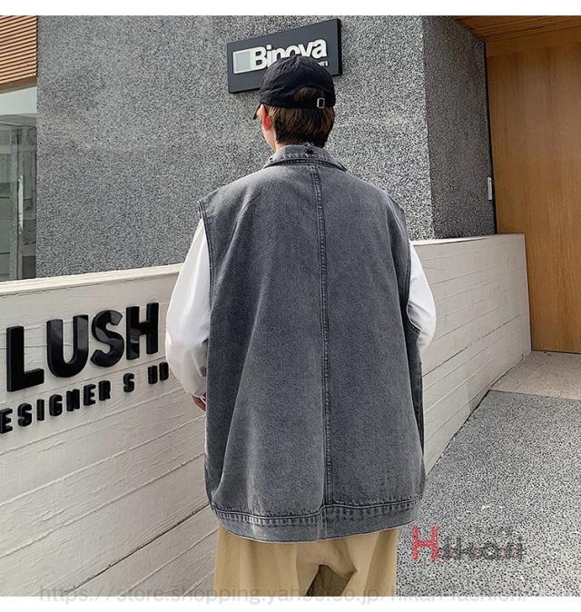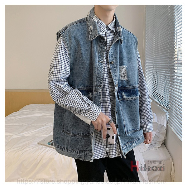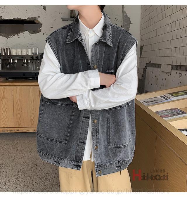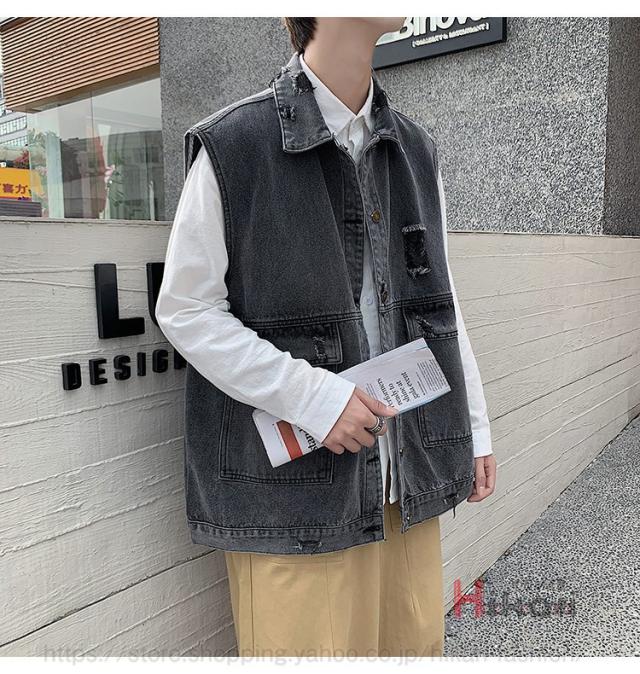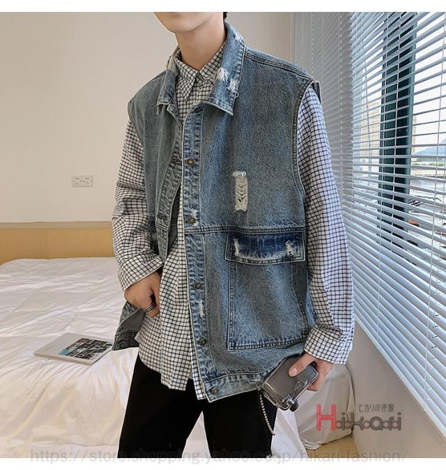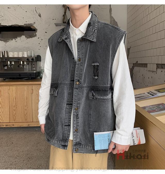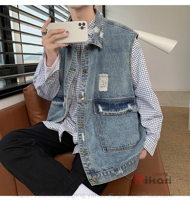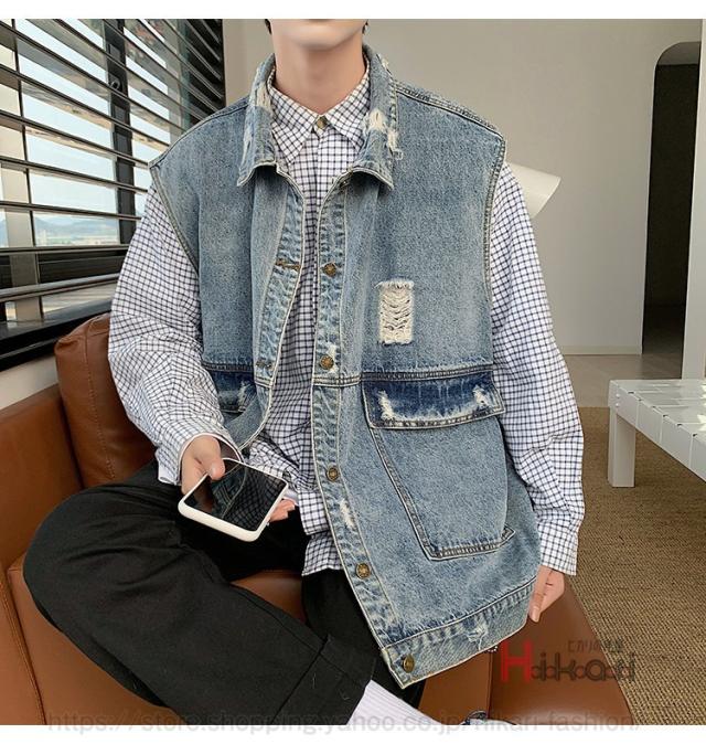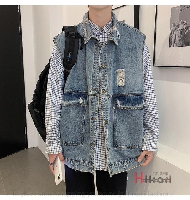 ビッグシルエット デニムベスト メンズ デニム ベスト ノースリーブ ジャケット ダメージ加工 アウター かっこいい