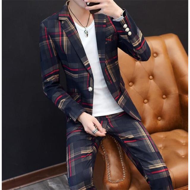 シングルスーツ 結婚式ビジネス紳士服チェック柄 2点セットテーラードジャケットスリム細身スラックス