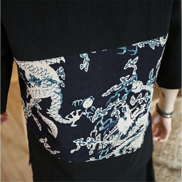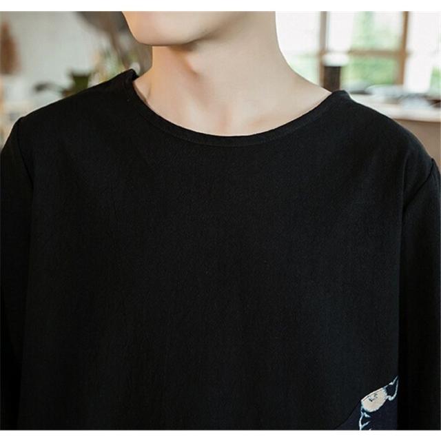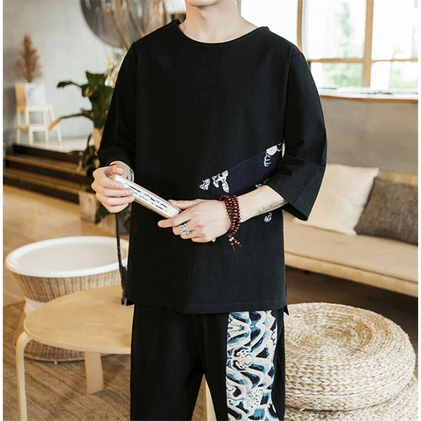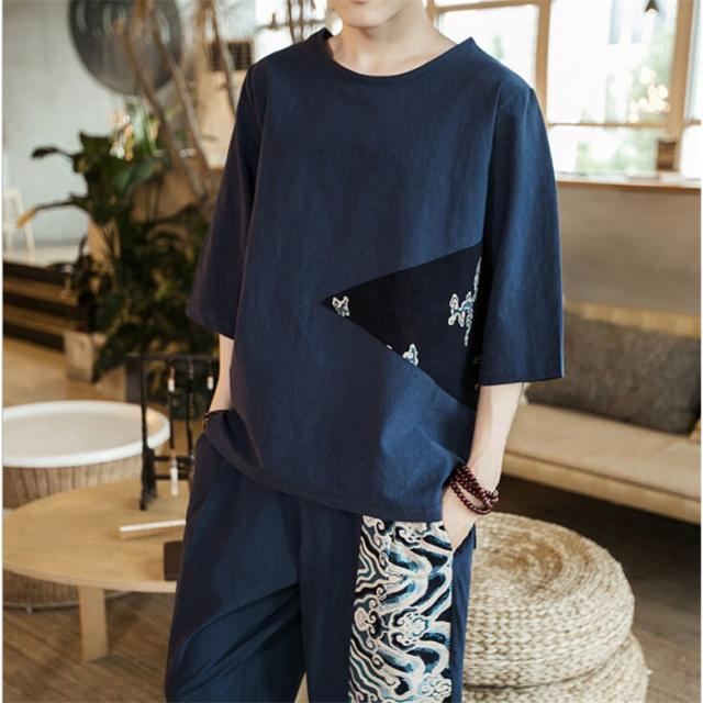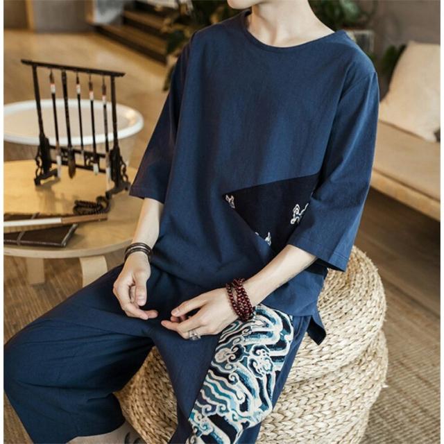 メンズtシャツ男性半袖綿麻リネン通気性和服風プリント花火大会カジュアル2色切替春夏