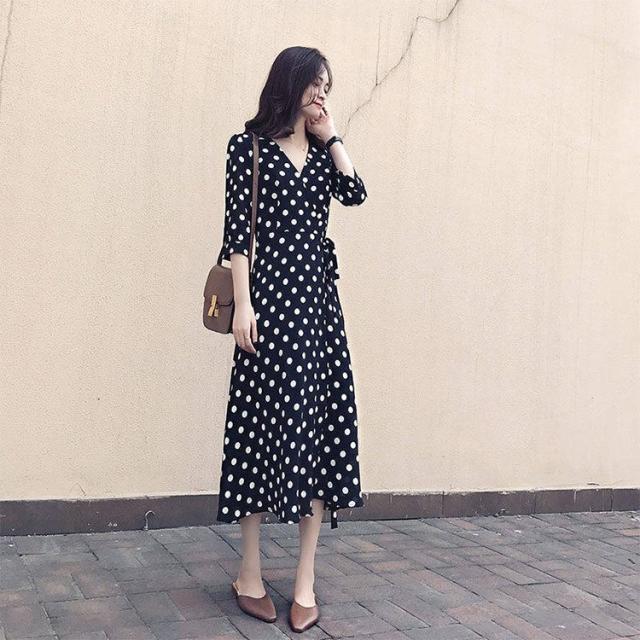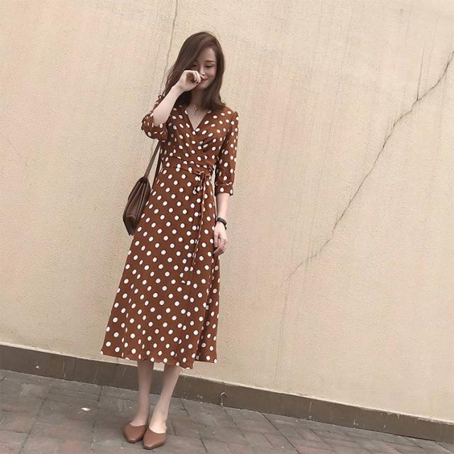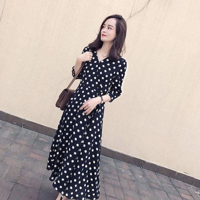 マキシワンピース レディース 40代 ワンピース 春 夏 七分袖 ワンピース ドット柄 vネック オシャレ お出かけ 大人 30代 50代 結婚式 二次会 韓国風 ゆったり