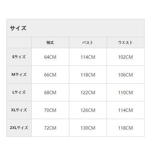 | サイズについての説明 | (サイズ) Sサイズ 袖丈64CM バスト114CM ウエスト102CM Mサイズ 袖丈66CM バスト118CM ウエスト106CM Lサイズ 袖丈68CM バスト122CM ウエスト110CM XLサイズ 袖丈70CM バスト126CM ウエスト114CM 2XLサイズ 袖丈72CM バスト130CM ウエスト118CM |