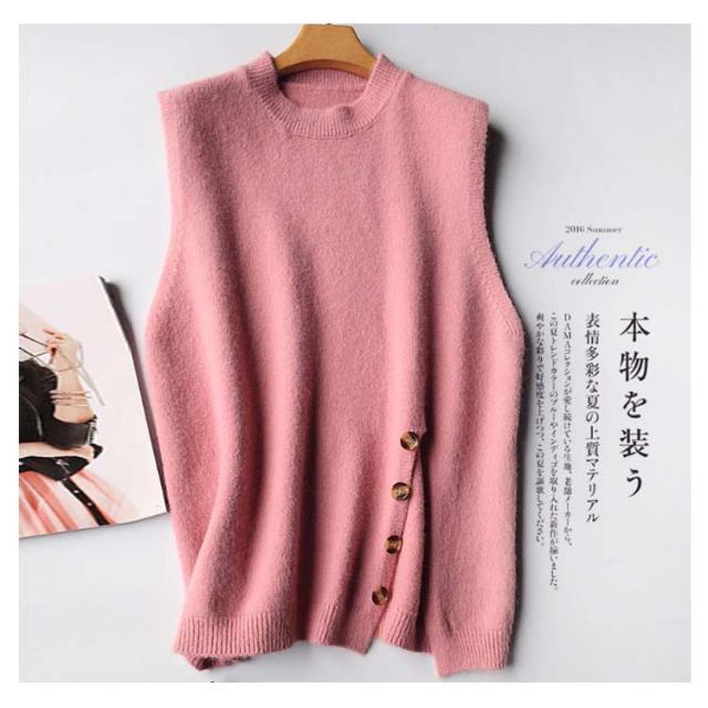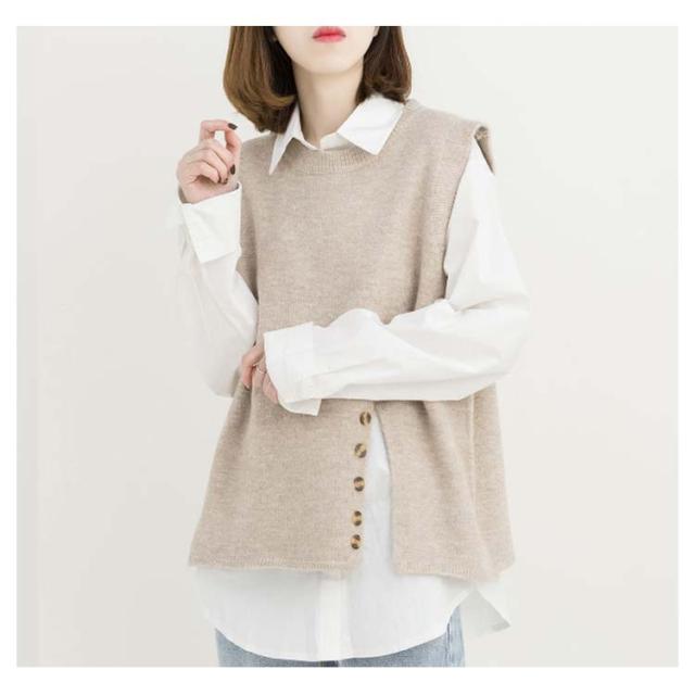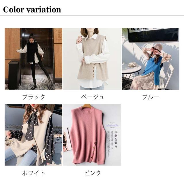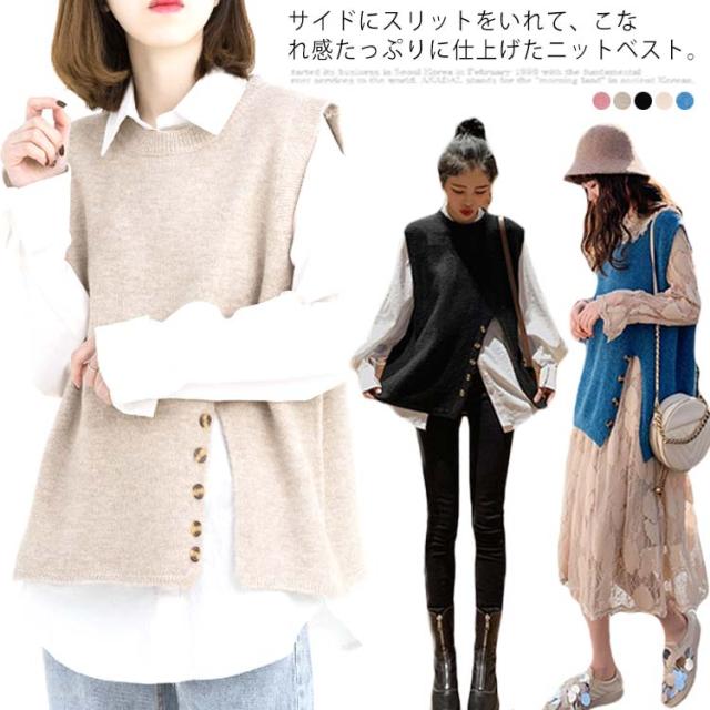【送料無料】サイドスリット レディース ベスト ニットベスト サイドボタン クルーネック スリット ラウンドネック ロング丈 おしゃれ 大人 可愛い レイヤード コーデ ノースリーブ トップス 普段着 韓国 シンプル 無地 春 秋 冬 黒 ブラック ベージュ