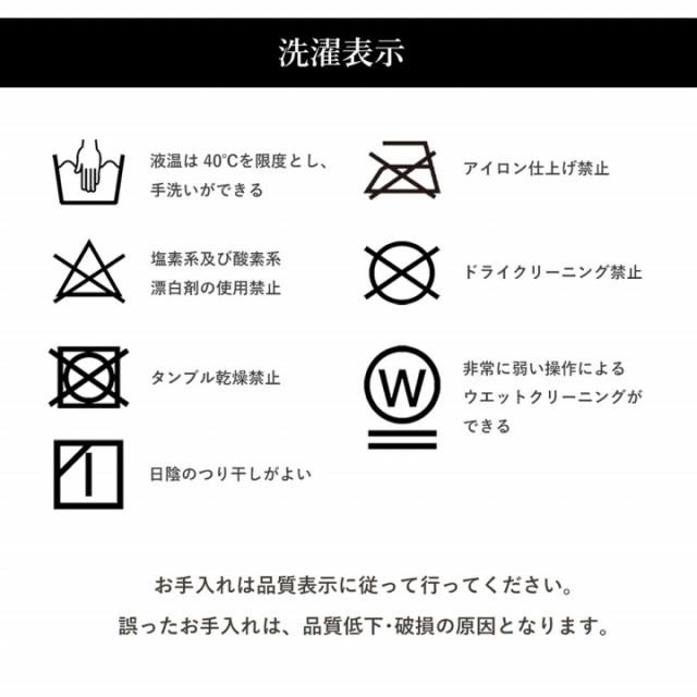 | 洗濯表示 | 40℃以下の水温で弱い手洗いで洗濯してください。(洗濯機は使用できません。) 干し方=日陰のつり干しがよい。 |