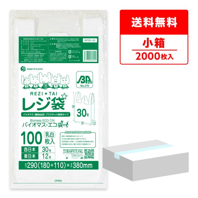 【小箱販売】BPRS-30kobako バイオマスプラスチック使用レジ袋 西日本30号(東日本12号) 0.014mm厚 乳白 100枚x20冊 厚手タイプ ブロック有 送料無料