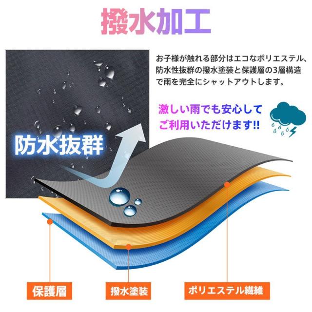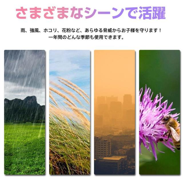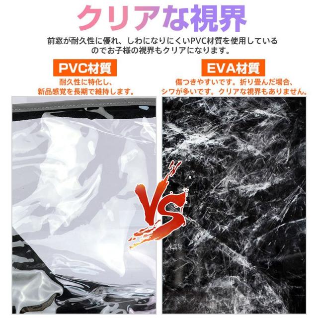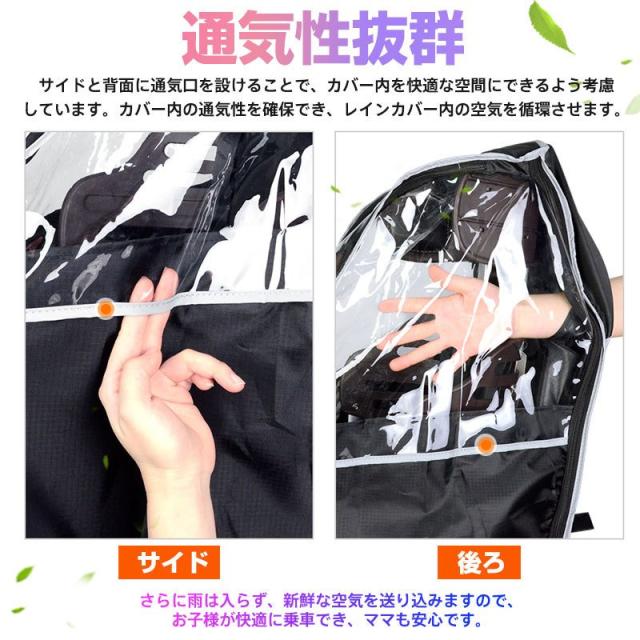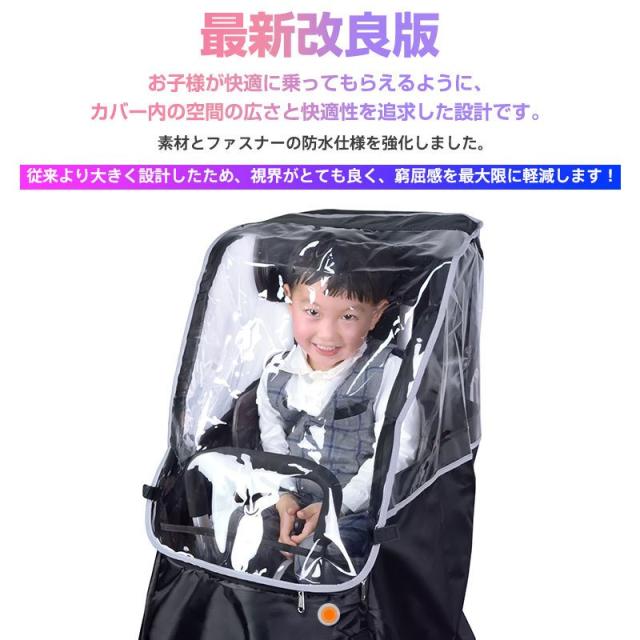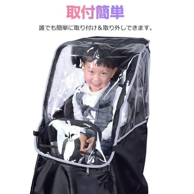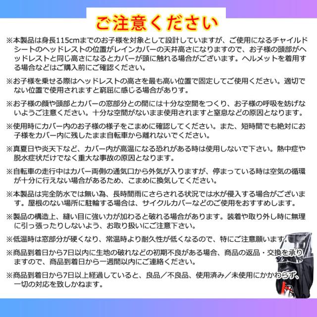※本製品は身長115cmまでのお子様を対象として設計していますが、ご使用になるチャイルドシートのヘッドレストの位置がレインカバーの天井高さになりますので、お子様の頭部がヘッドレストと同じ高さになるとカバーが頭に触れる場合がございます。ヘルメットを着用する場合などはご購入前にご確認ください。