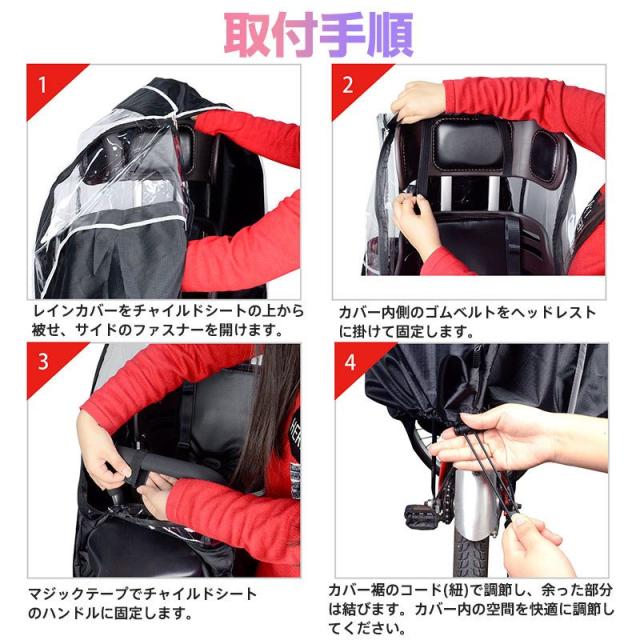 | 自転車チャイルドシート用 後ろ用子供乗せレインカバー 乗り降り簡単 自転車用 リア用 防水抜群 取付簡単 乗り降り自由 素材:PVC、ポリエステル 対応子供乗せ:ヘッドレスト付後ろ用幼児座席 (ヘッドレストの無いチャイルドシートには使用不可) 最新改良版&自転車後ろ用チャイルドシートレインカバーです。素材とファスナーの防水仕様を強化しました。前窓が耐久性に優れ、しわになりにくいPVC材質を使用します。従来より大きく設計したため、視界がとても良く、窮屈感を最大限に軽減します!お子様が触れる部分はエコなポリエステル、防水性抜群の撥水塗装と保護層の3層構造で雨を完全にシャットアウトします。激しい雨でも安心してご利用いただけます。サイドと背面に通気口を設けることで、カバー内を快適な空間にできるよう考慮しています。カバー内の通気性を確保でき、レインカバー内の空気を循環させます。さらに雨は入らず、新鮮な空気を送り込みますので、お子様が快適に乗車でき、ママも安心です。パイピング・ロゴマーク部分に反射素材を使用し、夜間走行の安全性を高めています。滑りのいいファスナーを採用し、急に雨が降り時、レインカバーを速く簡単に着装できて、お子様も乗り降りやすいです。また、改良版のファスナーが防水タイプであり、雨が漏れなく完全防水を実現します。カバー内側のゴムベルトをヘッドレストに掛けて、マジックテープでチャイルドシートのハンドルに固定しますので、カバーのズレを防ぎます。カバー裾のコードをキュッと絞れば、カバーのフィット感の調節が可能です。誰でも簡単に取り付け&取り外しできます。コンパクトに収納可能な収納バッグ付きで、通勤・通学バッグの中に入れても問題ないです。雨、強風、ホコリ、花粉など、あらゆる脅威からお子様を守ります!一年間のどんな季節も使用できます。 ※本製品は身長115cmまでのお子様を対象として設計していますが、ご使用になるチャイルドシートのヘッドレストの位置がレインカバーの天井高さになりますので、お子様の頭部がヘッドレストと同じ高さになるとカバーが頭に触れる場合がございます。ヘルメットを着用する場合などはご購入前にご確認ください。 ※お子様を乗せる際はヘッドレストの高さを最も高い位置で固定してご使用ください。適切でない位置で使用されますと窮屈に感じる場合があります。 ※お子様の顔や頭部とカバーの窓部分との間には十分な空間をつくり、お子様の呼吸を妨げないようご注意ください。十分な空間がないまま使用されますと窒息などの原因となります。 ※使用時にカバー内のお子様の様子をこまめに確認してください。また、短時間でも絶対にお子様をカバー内に残したまま自転車から離れないでください。 ※真夏日や炎天下など、カバー内が高温になる恐れがある時は使用しないで下さい。熱中症や脱水症状だけでなく重大な事故の原因となります。 ※自転車の走行中はカバー両側の通気口から外気が入りますが、 停まっている時は空気の循環が十分に行えない場合があるため、こまめに換気してください。 ※本製品は完全防水では無い為、長時間雨にさらされる状況では水が侵入する場合がございます。屋根のない場所に駐輪する場合は、サイクルカバーなどのご使用をおすすめします。 ※製品の構造上、縫い目に強い力が加わると破れる場合があります。装着や取り外し時に無理に引っ張ったりしないよう、お取り扱いにご注意下さい。 ※低温時は窓部分が硬くなり、常温時より耐久性が低くなるので、特にご注意願います。 ※商品到着日から7日以内に生地の破れなどの初期不良がある場合、商品の返品・交換を承りますので、商品到着日から一週間以内にご連絡ください。 ※商品到着日から7日以上経過していると、良品/不良品、使用済み/未使用にかかわらず、 一切の対応を致しかねます。 |