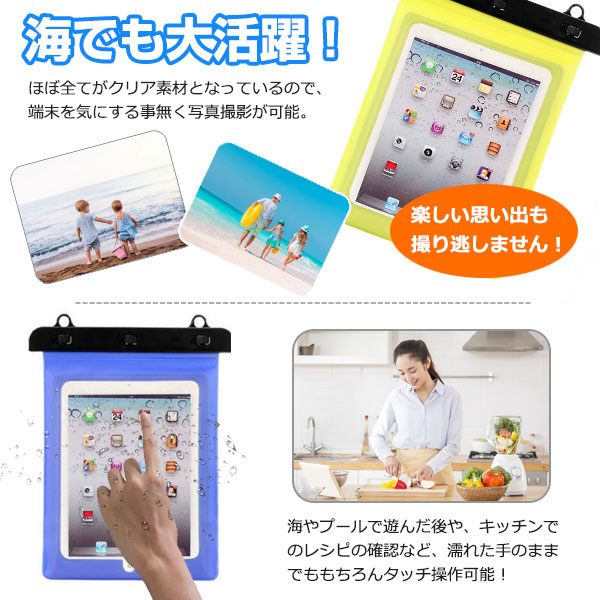 | 10.1インチ タブレットPCケース 防水 タブレットケース 防水カバー タブレット防水ケース ストラップ付き タブレット防水ポーチ 防水タブレットケース 10.1インチ迄の各種タブット対応 スマホグッズ タブレットアクセサリー ipad お風呂 海 プール キッチン 素材:PVC サイズ:265*210mm ※表記サイズは平置きサイズです。タブレットPCの厚さや形状によって収納できない場合がありますので、お手持ちのタブレットPCのサイズをよくご確認のうえ、お買い求めください。10.1インチタブレットPC用防水ケースです。柔軟性に富んで経年劣化も少ないPVC素材を採用し、耐久性よく、長くお使いできます!手が濡れていても、ケースに入れたままタブレットの操作が可能です!正面も背面もクリアな設計で、ケースに入れたまま、防水しながらもタッチ操作や写真・動画撮影も可能です。ロック3つ付きなのでケース内へ水の浸入を防ぐので水場でも安心してタブレットを使用できます。 持ち運びしやすいストラップ付きで、ストラップ穴に通すと首にかけて使用することができ、また、長さ調整も可能です。海やプールはもちろん、お風呂などの日常生活でも大活躍するアイテムです。 ※2013年以前に発売されたモデルは対応しません。 ※ご使用前にケース内にティッシュなどを入れ、水に浸けるなどをして内部の防水を確認してください。 ※簡易防水・浸水防止製品の為、水中での使用を目的としていません。 ※防水ケースに入れた状態で、指紋認証機能はご利用頂けません。 ※本商品ご使用時における脱落・浸水等が起きた場合でも、一切の責任は負いかねます。 ※入荷状況により予告なし、デザインなど若干変更する場合がございます。ご了承くださいませ。 |