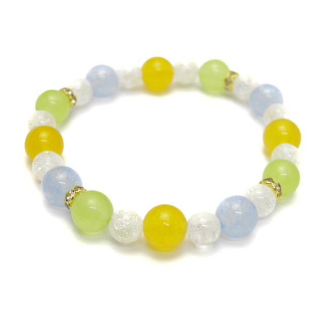 ■商品の内容 ブレスレット 夏ブレス 海 パワーストーン プチギフト 転勤 退職 お礼 お祝い 誕生日 母の日 敬老の日 クリスマス ギフト プレゼント夏の眩しい日差しや爽やかな海の色をイメージしたブレスレットです。クラッシュされた石が太陽の光で輝く、夏にぴったりのブレスレットです。 ■素材・サイズ 素 材&サイズ:カラージェード:8mm、クラッシュレインボークォーツ:6mm、花型ロンデル(金):5mm、内径:15cm